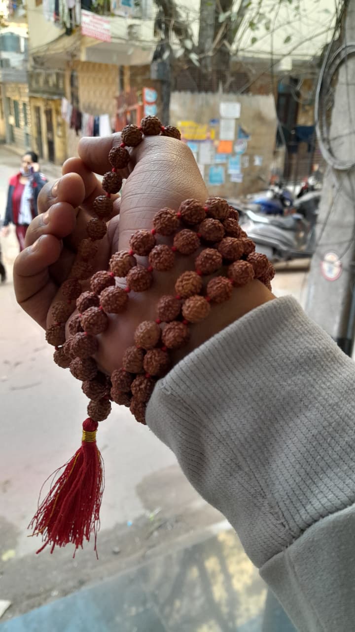 Step 1 – Individual Bead Selection Har ek bead individually select hoti hai. "Regular" grade ka matlab low quality nahi – iska matlab hai standard size aur affordable price point. Har bead Nepal origin, har bead 5 mukhi verified.