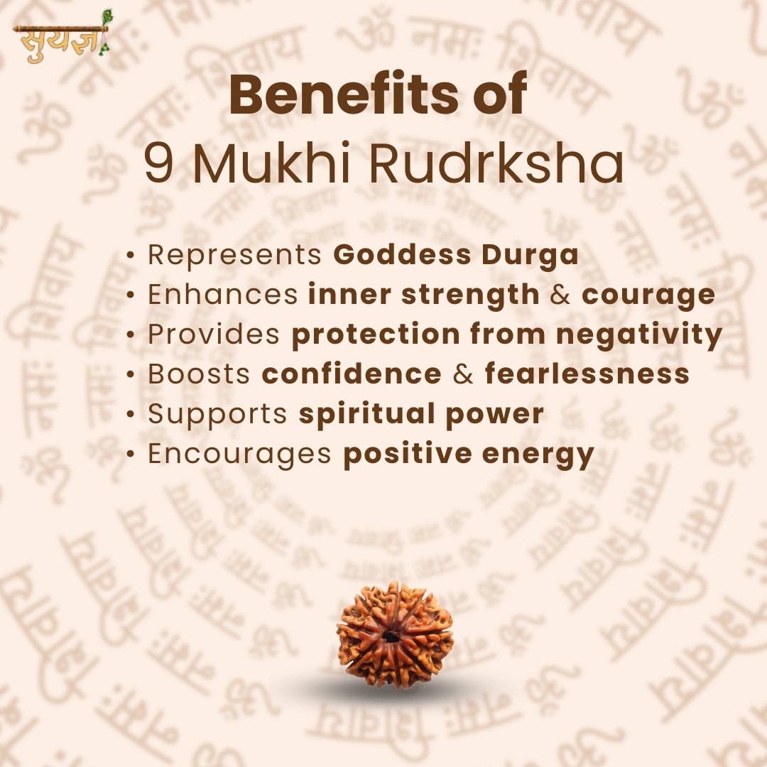 9 Mukhi specifically Maa Durga ke 9 forms (Navdurga) se associated hai. Yeh Rudraksha represent karta hai: