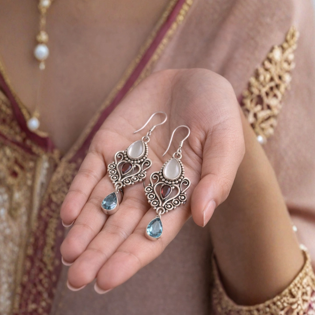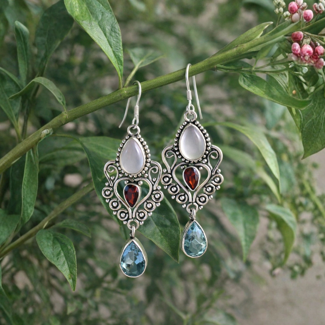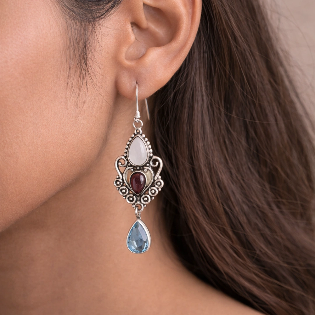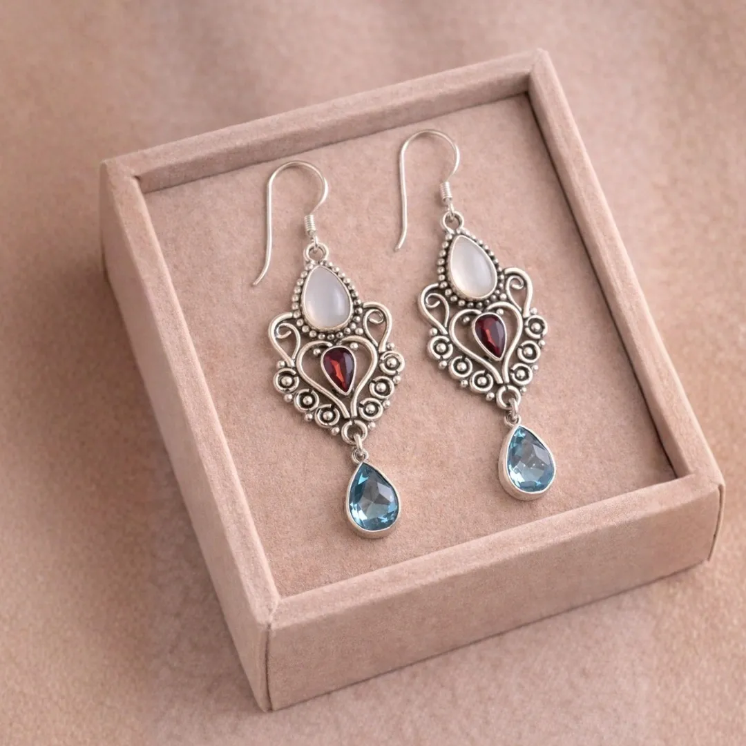 Yeh 925 Sterling Silver Natural Blue Topaz, Garnet & Rose Quartz Earrings ready hain tujhe COMPLETE support dene ke liye. Calm chahiye? Passion chahiye? Love chahiye? Yeh earrings TEENO deliver karti hain ek beautiful colorful package mein.