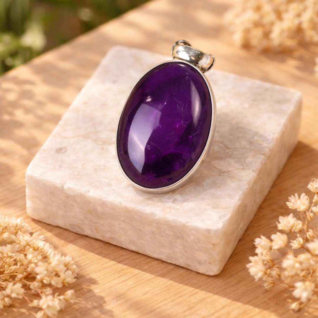 The Amethyst Divine Oval Pendant is large enough to be felt. Deep purple enough to be unmistakable. Oval enough to carry its ancient meaning. Set in silver, which in crystal healing tradition amplifies and conducts energy rather than blocking it.