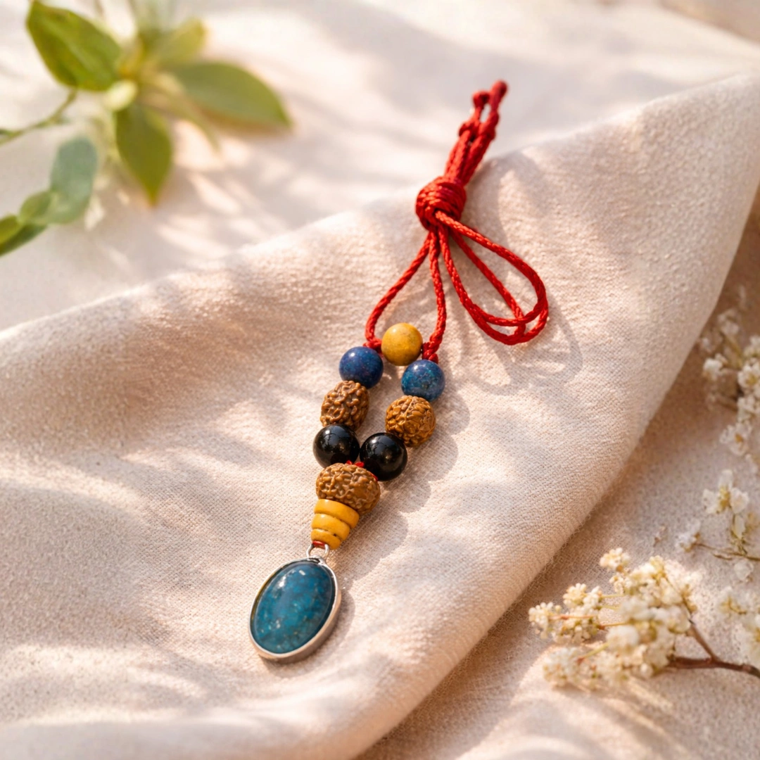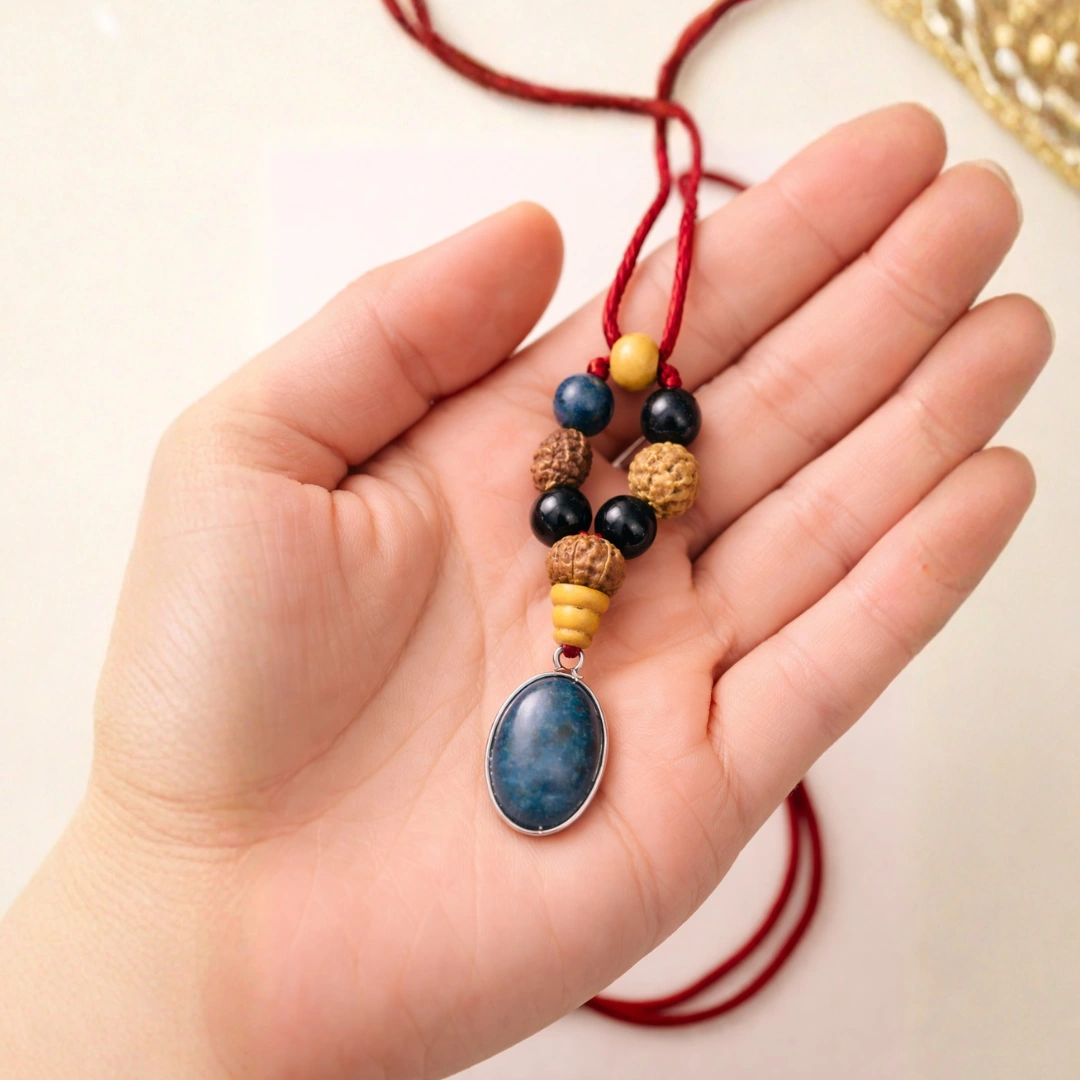 At Suyagya: Every Turquoise oval individually verified — genuine stone, natural matrix, real quality. Every Lapis Lazuli bead authenticated — real navy blue with natural pyrite, not dyed imitation. Every Black Amethyst bead confirmed genuine. Every Rudraksha bead authenticated — genuine 3, 7, and 10 mukhi lines confirmed. Government lab certified for the complete pendant. Certificate on request, always. Every Aquarius Kumbh Rashi Pendant cleansed and Saturn-activated before dispatch — sound cleansing, Saturday Shanivaar moonlight setting, Om Shanaischaraya Namaha activation.