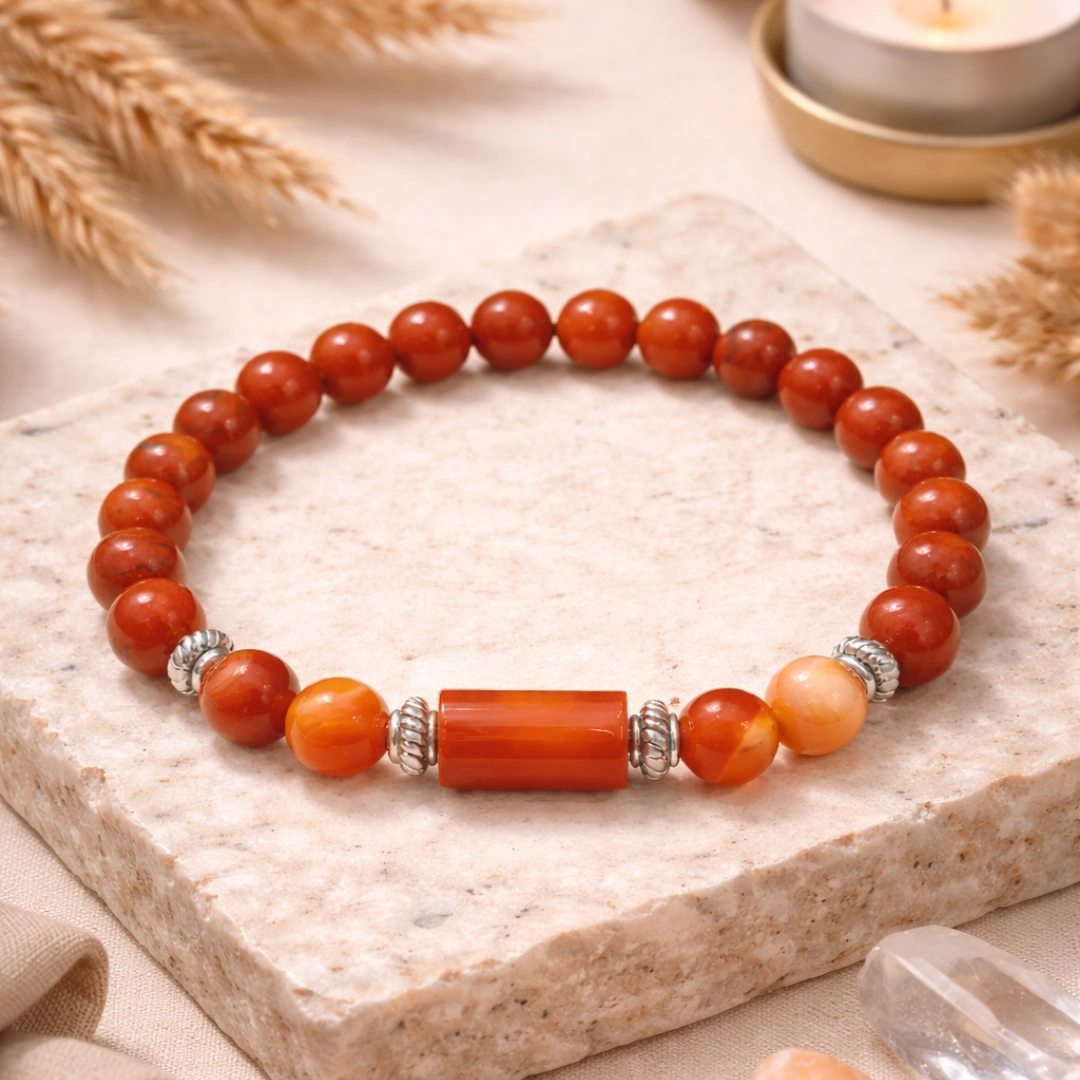 Together, red jasper and carnelian create the complete energetic support system that Mesh rashi was born for: deep roots, brave action, Mars fire channeled into constructive power.