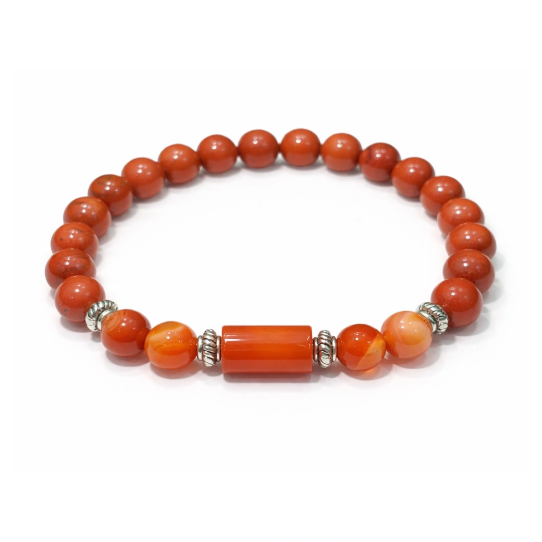 On either side of the carnelian centerpiece, two larger carnelian beads — transitional, bridging the grounding red jasper on both sides with the courageous center. Silver spacers frame the centerpiece — clean, strong, grounding the overall design without overwhelming it.