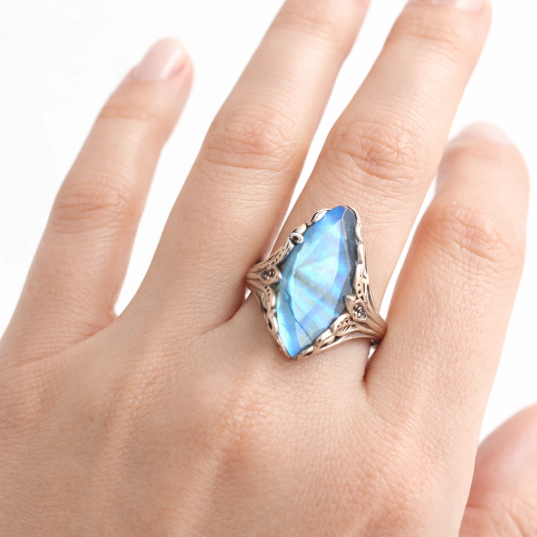 SUYAGYA ka Flashy Labradorite Marquise Ring specifically un stones se bani hai jinmein yeh magical flash clearly visible hai. Kyunki agar Labradorite mein flash nahi, toh magic nahi.