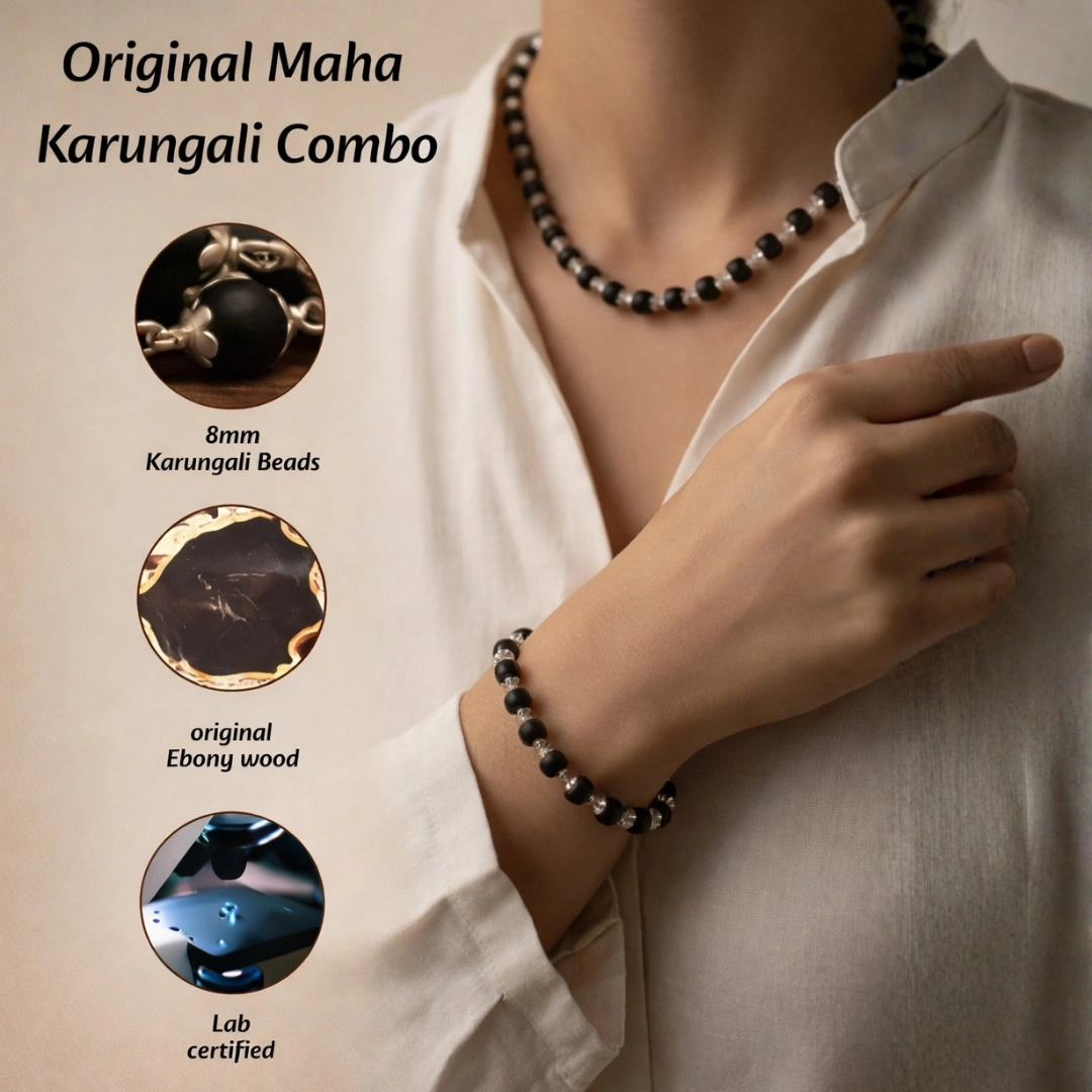Worn separately, each piece carries full Karungali power. Worn together, something different happens.