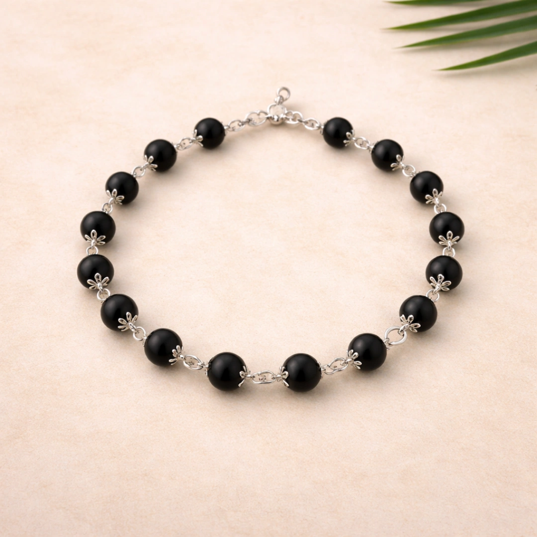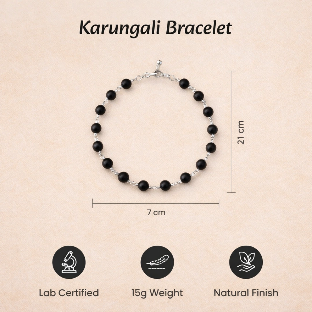The bracelet wraps the wrist — the pulse point, the place where the body's energy flow is most accessible and most direct. The wrist is where Vedic medicine and energy practice have always worked — the nadi (energy channel) at the wrist connects to the heart directly. The bracelet at the wrist keeps Karungali's protection continuous and physically present through every activity: work, conversation, travel, prayer.