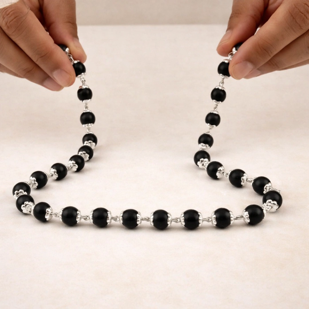 Plus — dikhne me killer lagta hai. Deep black beads + silver shine = premium look. Office me pehn, party me pehn, date pe pehn, temple me pehn — har jagah suit karega.