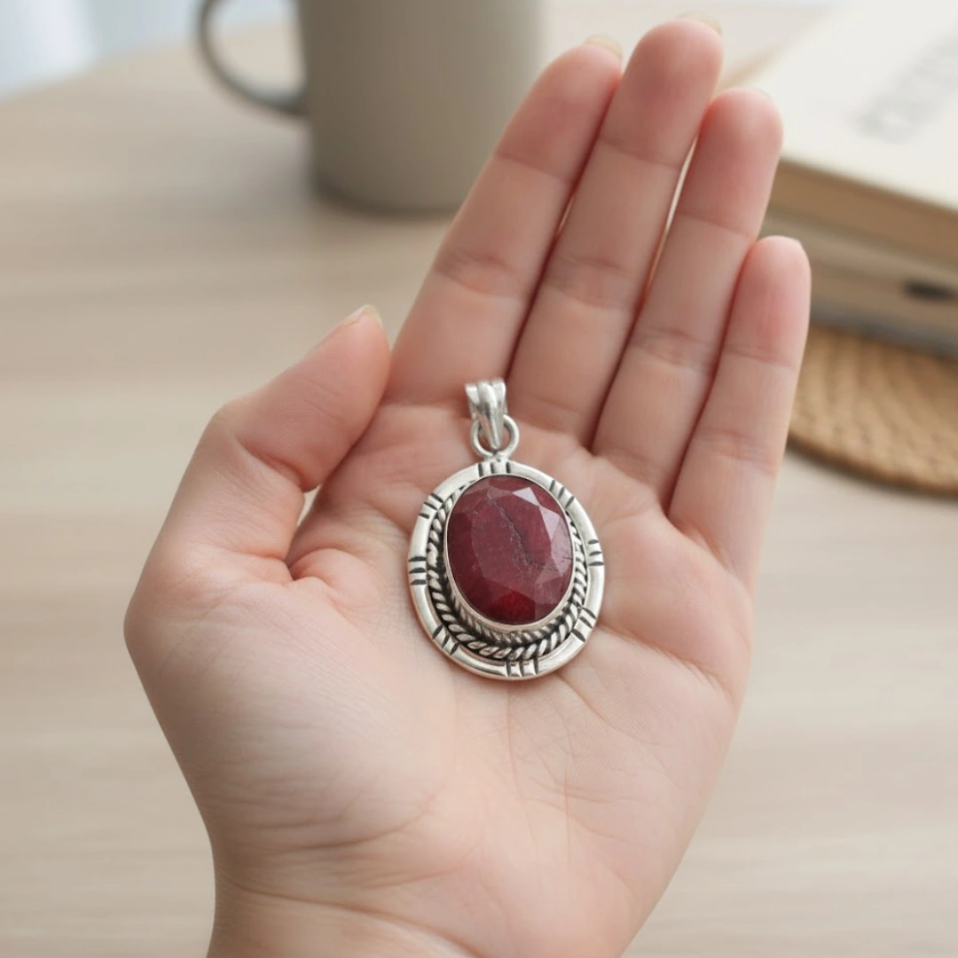 Ruby Sun ki gemstone hai – source of all light, energy, aur life. Sun humare solar system ka heart hai. Aur jab aap ruby ko pendant ke roop mein pehente hain, yeh stone aapke heart ke paas rehta hai – creating a beautiful symbolic connection between the cosmic heart (Sun) aur your physical heart.