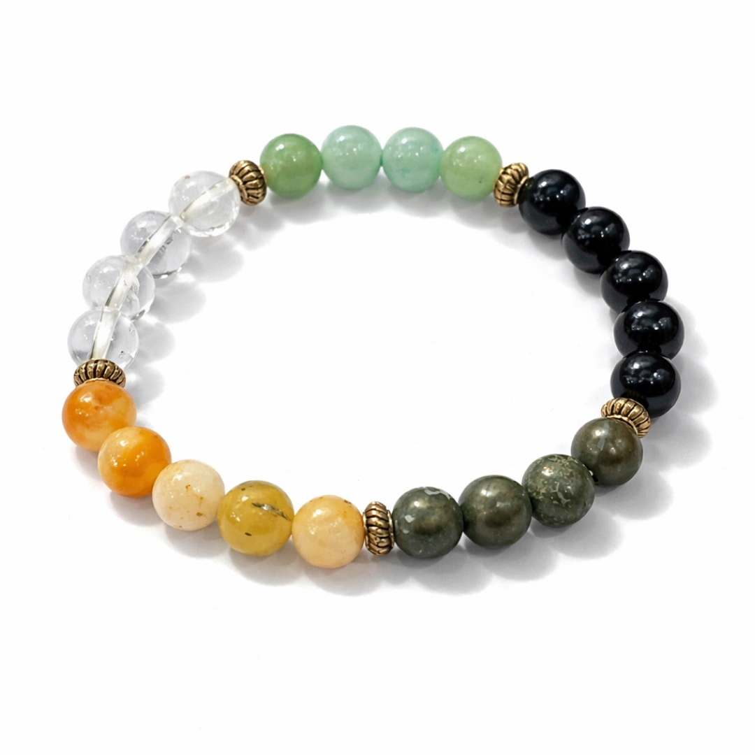 "Pyrite paisa attract karta hai. Green Aventurine luck laata hai. Yellow Aventurine creative soch deta hai. Clear Quartz sab ki energy double karta hai. Hakik protect karta hai. Aur yeh paanch milke teri kalaai pe ek money magnet system banate hain. Rs 599 me. Seedhi baat."