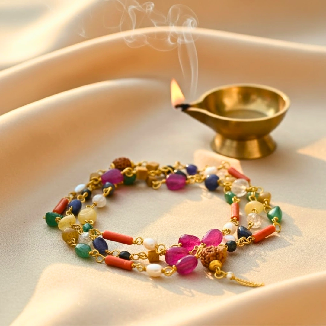 Gale Me Pehno: Daily planetary balance. Important events pe extra support. Pooja Room Me Rakho: Navgraha energy ghar me radiate hogi. Deities ke paas rakh. Diwali Pooja: Navratna mala Diwali pe rakhna bahut shubh hai. Navgraha Pooja: Specific planetary rituals me use karo. Meditation: "Om Navagraha Devtaye Namaha" chant karte hue hold karo. Griha Pravesh: New home me Navgraha blessings ke liye rakh. Gift: Affordable meaningful spiritual gift — students, family, friends ko do.