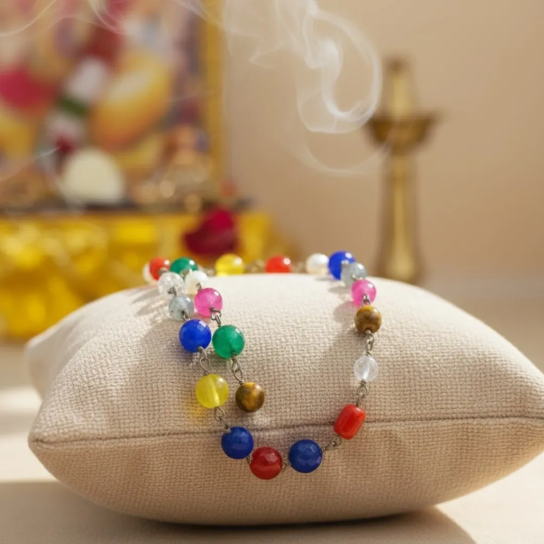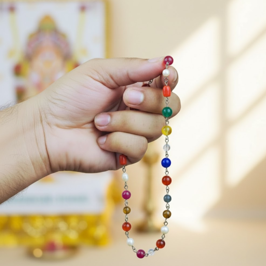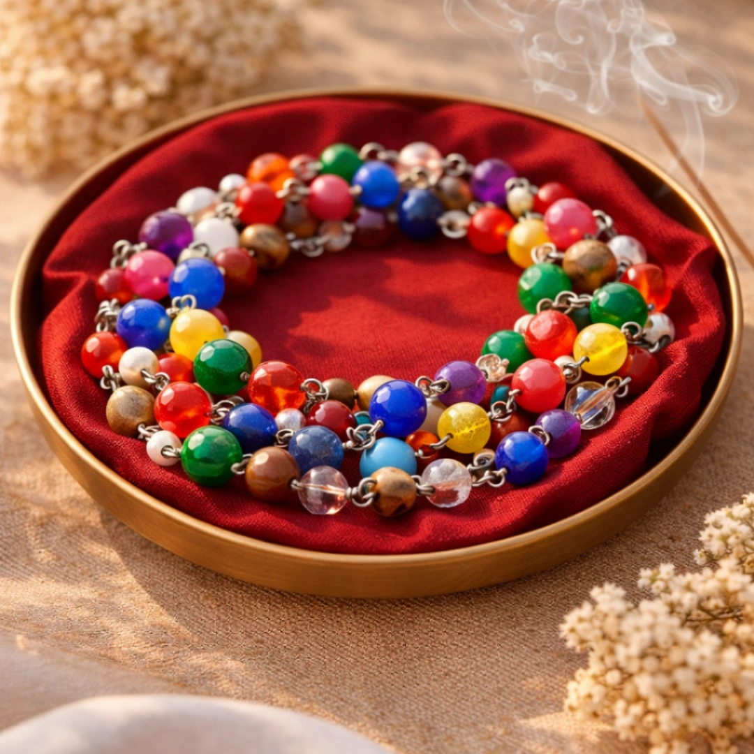 No Kundli Required — Unlike single gemstones (which require careful kundli analysis to avoid wrong planet activation), Navrattan Mala is safe for everyone. All 9 stones balance each other — no risk of wrong stone, no side effects. Universal remedy.