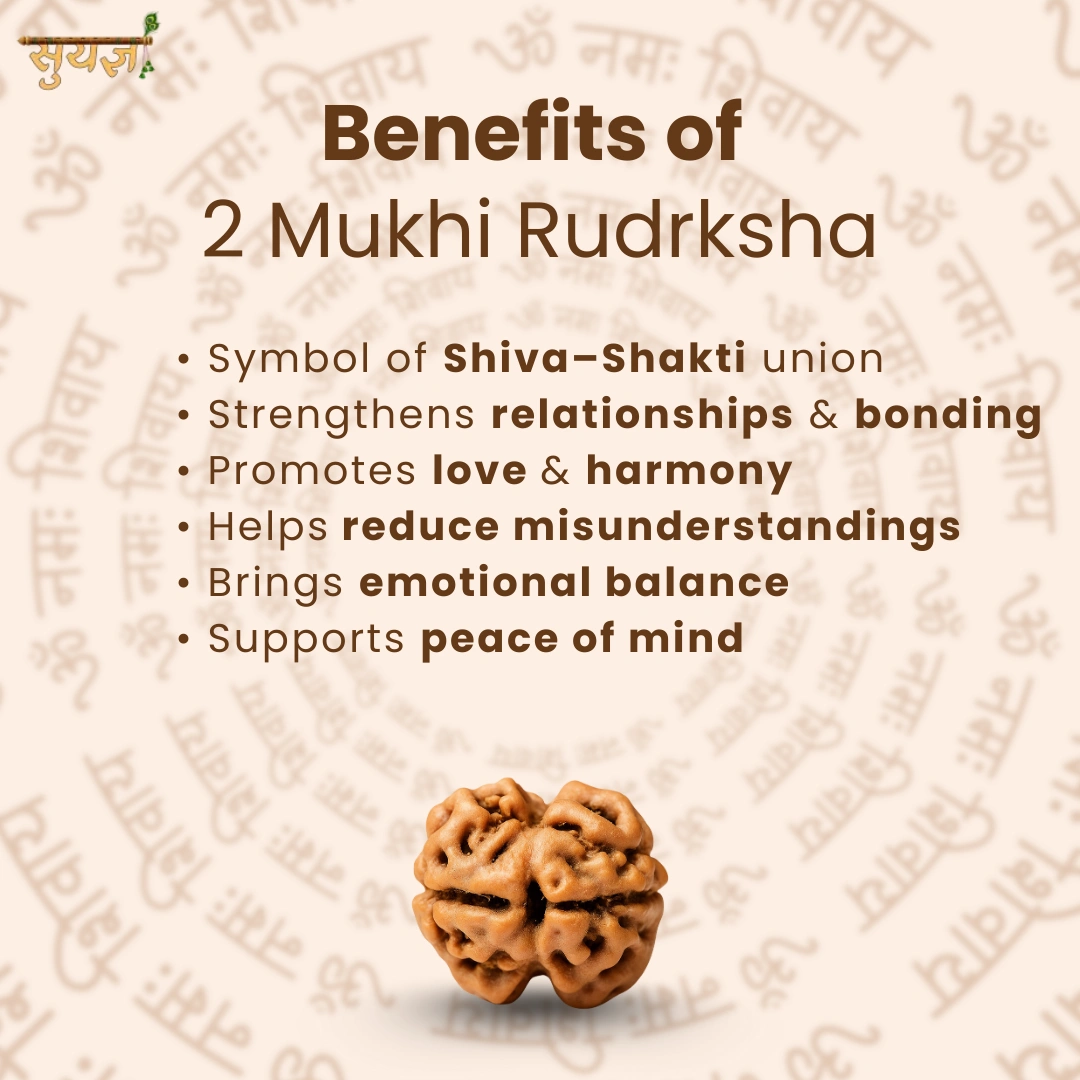 2 Mukhi Rudraksha Ardhanarishvara ko represent karta hai—half Shiv, half Parvati. Masculine aur feminine energy ka perfect union.