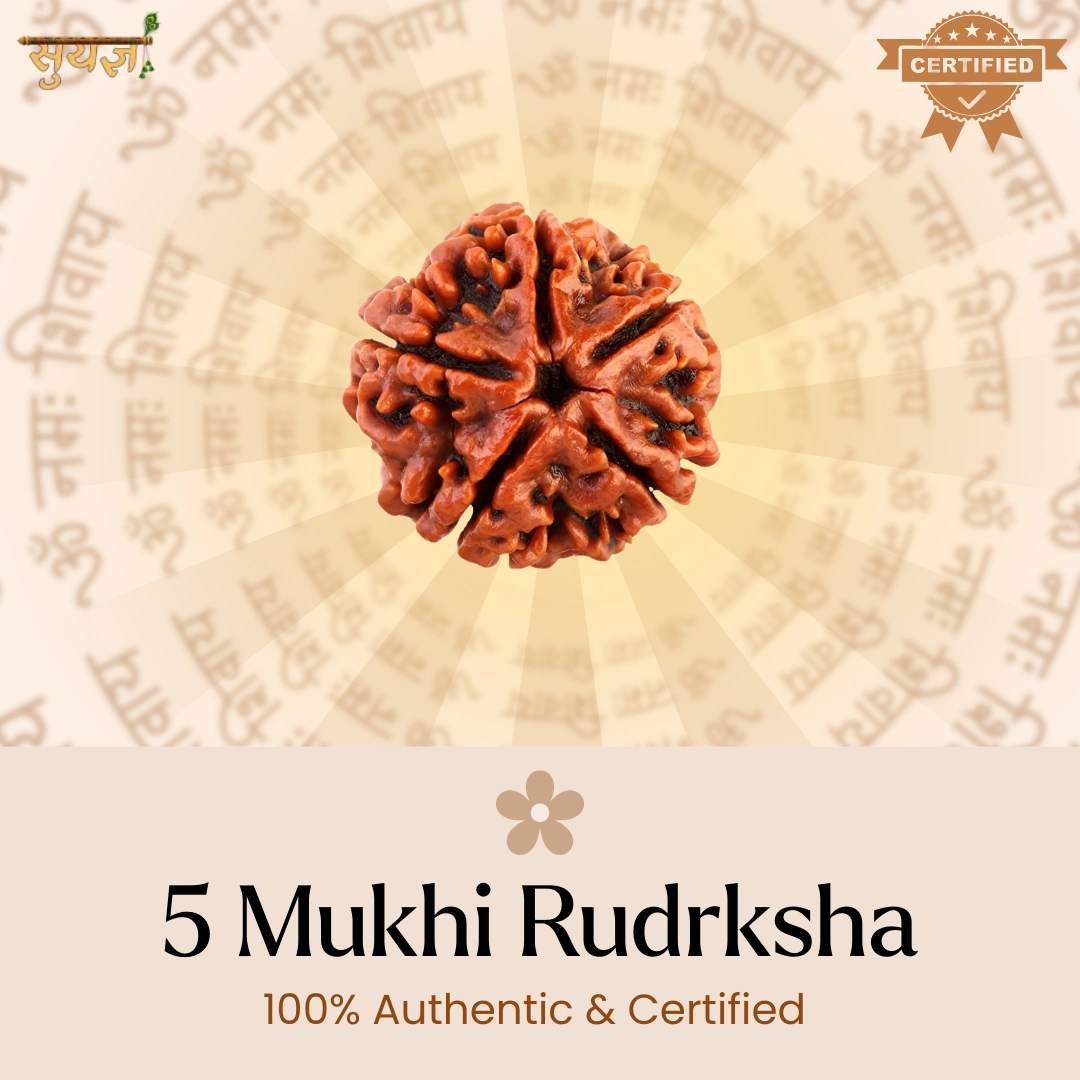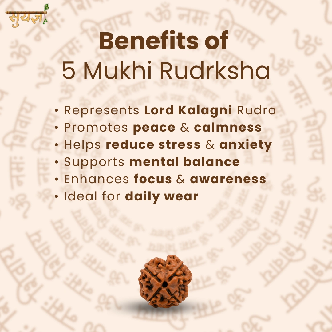 5 Mukhi Rudraksh traditionally mind ko shaant karne, emotions ko balance karne aur focus ko improve karne ke liye jaana jata hai.
