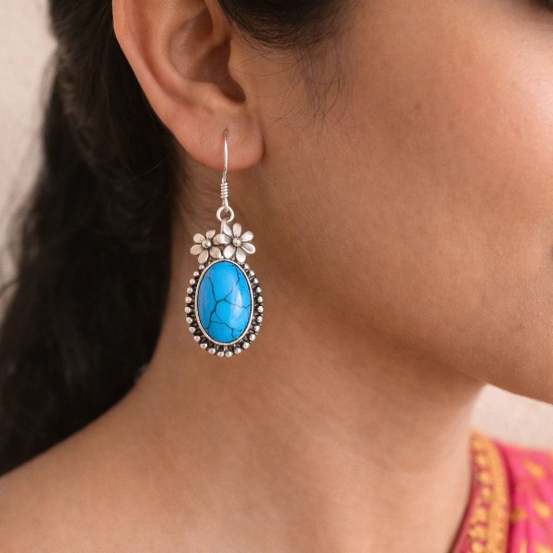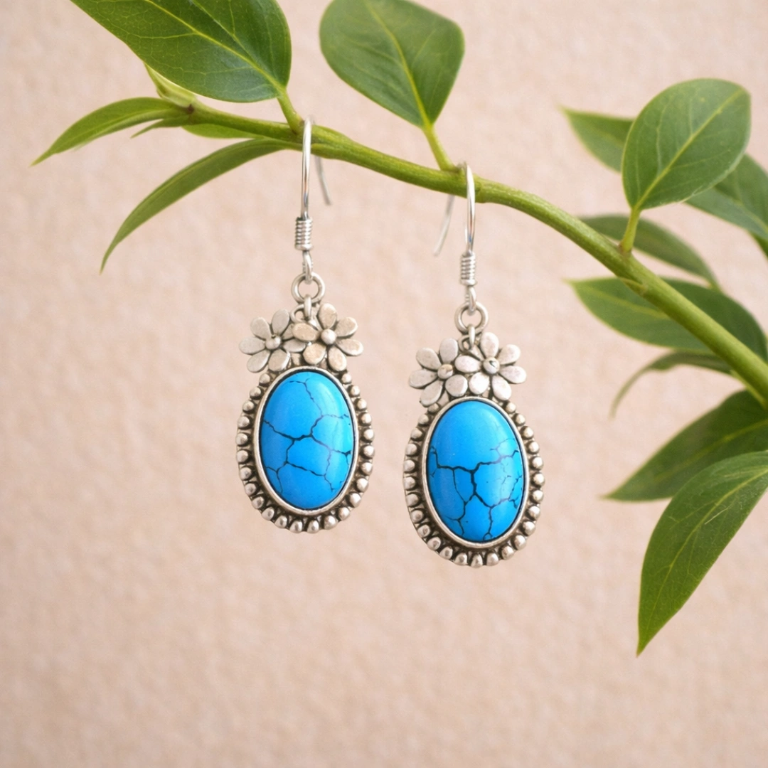 Yeh Western Flower Turquoise Earrings ready hain aapko ancient protection aur modern boho style dono dene ke liye. Western aesthetic chahiye? Turquoise protection chahiye? Unique design chahiye? Sab ek beautiful pair mein.