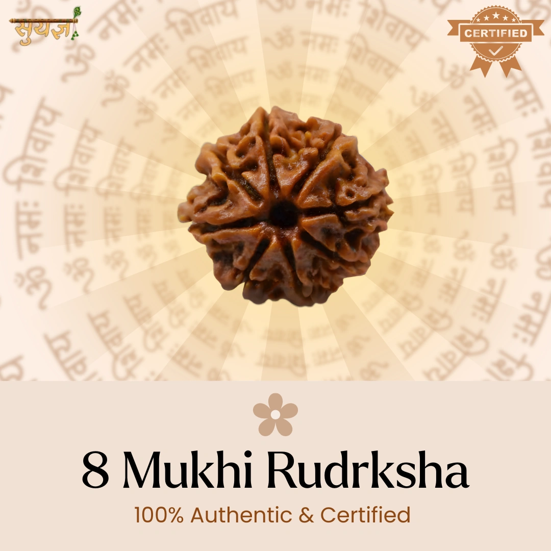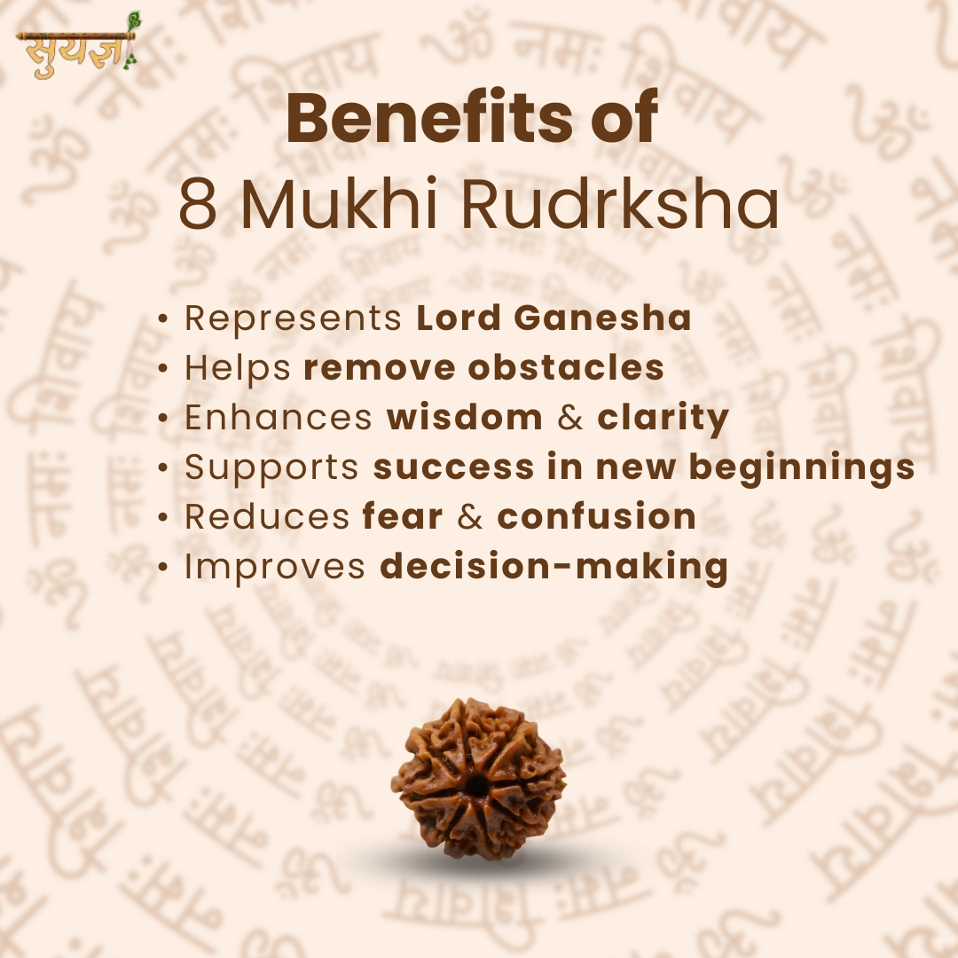 8 Mukhi Rudraksha ko hum Suyagya mein "fresh start ka Rudraksha" kehte hain. Kyunki yeh sirf obstacles hatane ke baare mein nahi hai – yeh us courage ke baare mein hai jo nayi cheezein start karne ke liye chahiye hoti hai.
