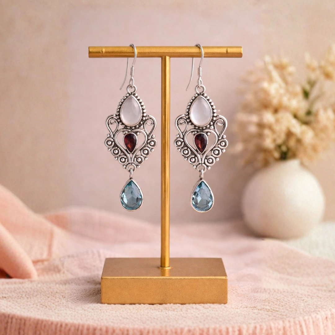 Yeh 925 Sterling Silver Natural Blue Topaz, Garnet & Rose Quartz Earrings ready hain tujhe COMPLETE support dene ke liye. Calm chahiye? Passion chahiye? Love chahiye? Yeh earrings TEENO deliver karti hain ek beautiful colorful package mein.