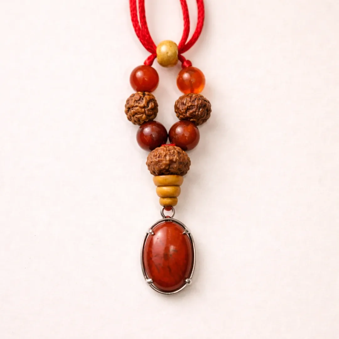 The Carnelian beads resting above the Red Jasper pendant form a natural energetic sequence: Carnelian activates the fire, Red Jasper grounds it. Activation and endurance, together, from the same piece.