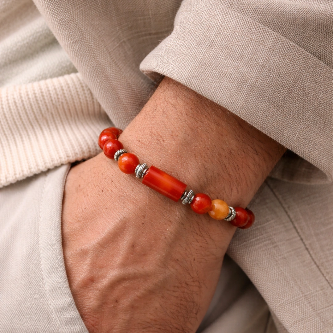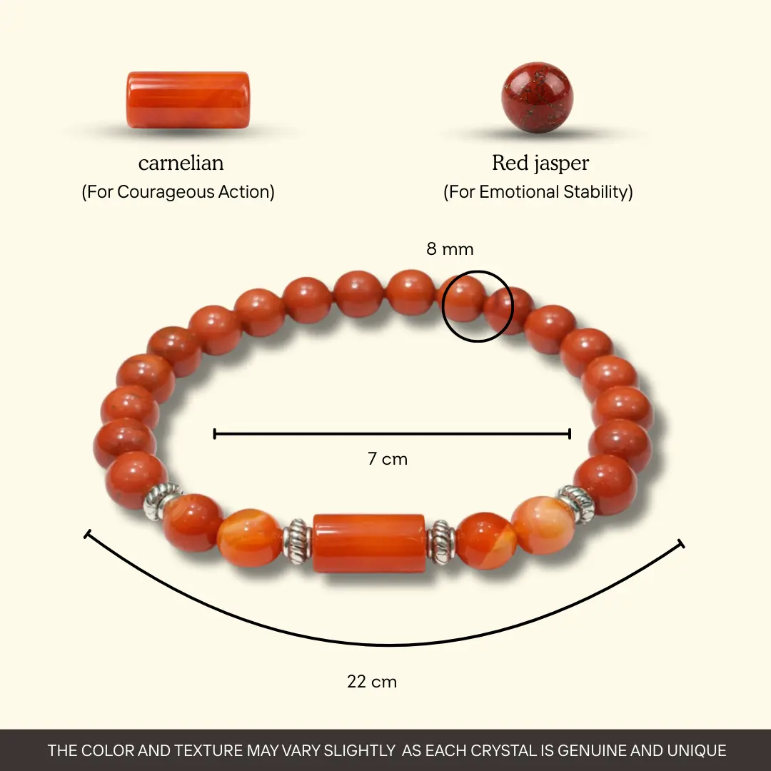 Together, red jasper and carnelian create the complete energetic support system that Mesh rashi was born for: deep roots, brave action, Mars fire channeled into constructive power.