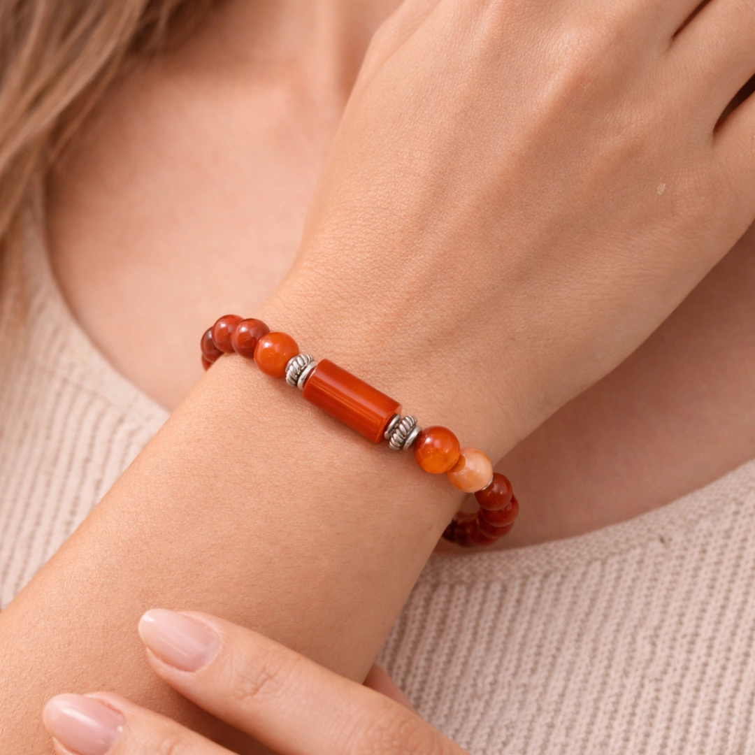 The centerpiece of the Aries Mesh Rashi Red Jasper Bracelet is carnelian — the warm orange-red stone that has been called the Stone of Courage, the Stone of Motivation, and in ancient Egypt, the Stone of the Rising Sun.