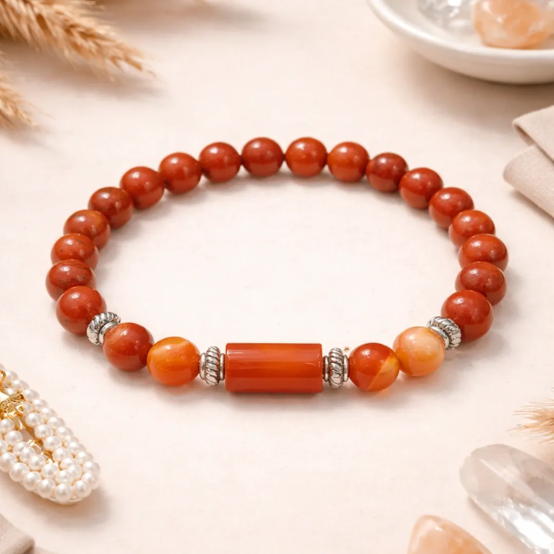 On either side of the carnelian centerpiece, two larger carnelian beads — transitional, bridging the grounding red jasper on both sides with the courageous center. Silver spacers frame the centerpiece — clean, strong, grounding the overall design without overwhelming it.