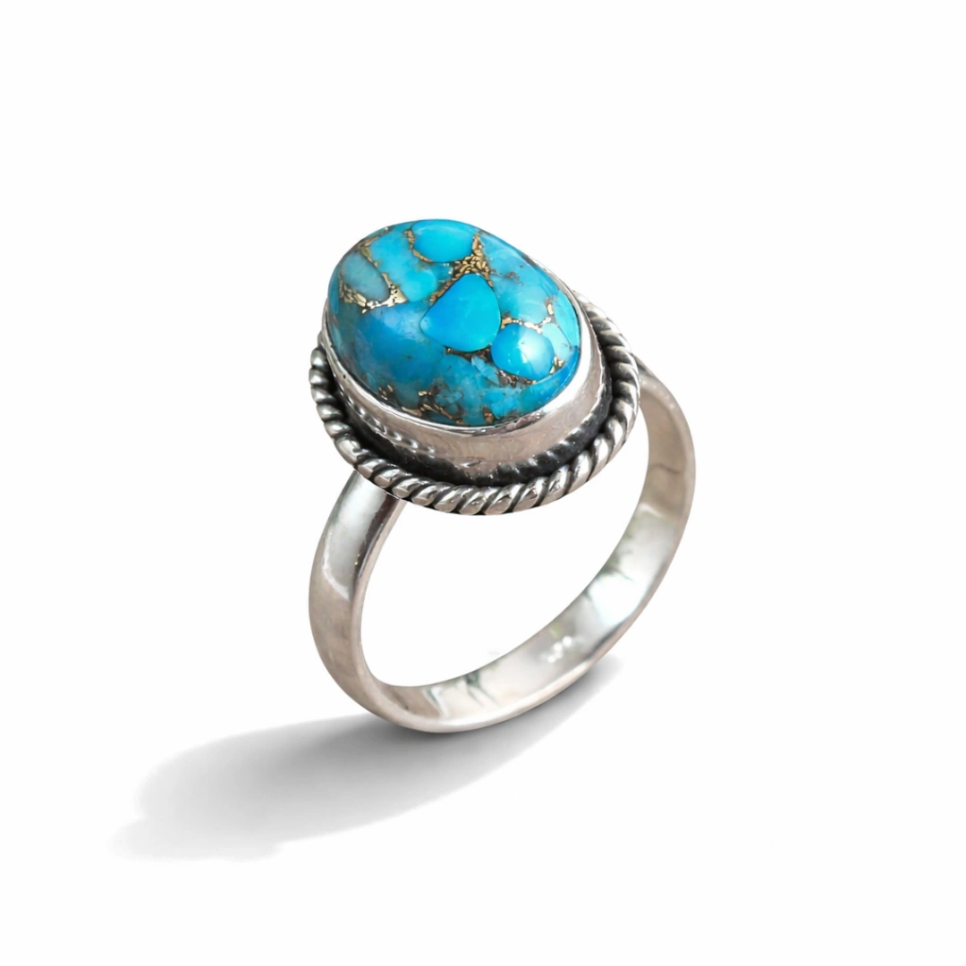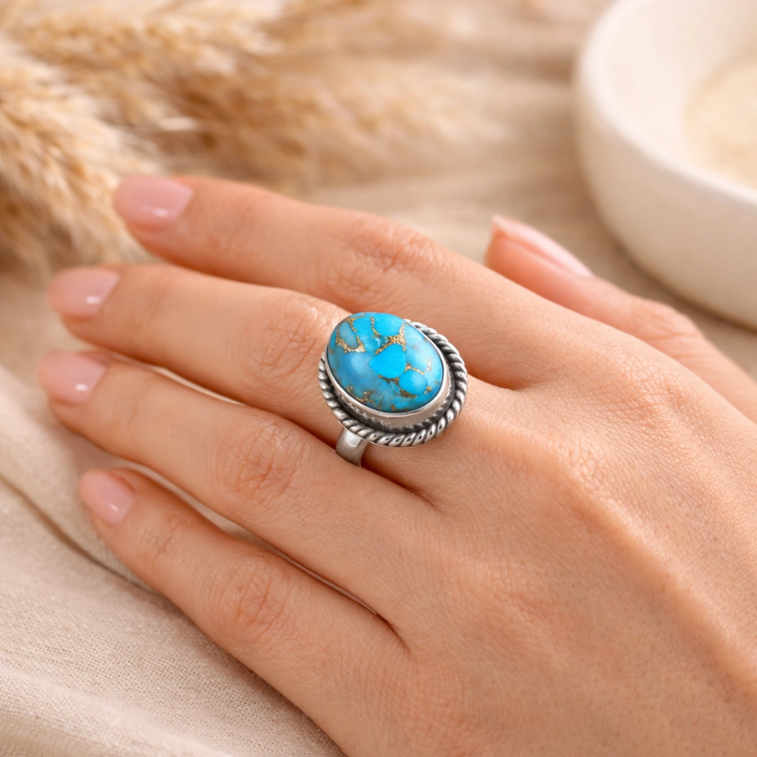 This Natural Blue Copper Turquoise Statement Ring is a stunning bohemian piece handcrafted in 925 Sterling Silver, featuring vibrant blue copper turquoise with natural matrix patterns. Turquoise is one of the world's oldest protective stones, revered for peace, protection, and authentic communication.