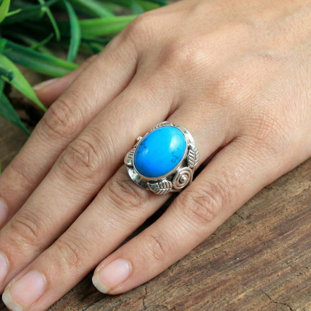 Natural matrix patterns: Har turquoise stone unique hai—woh black/brown veining (matrix) Earth ki signature hai. No two stones identical—aapki ring one-of-a-kind hai.