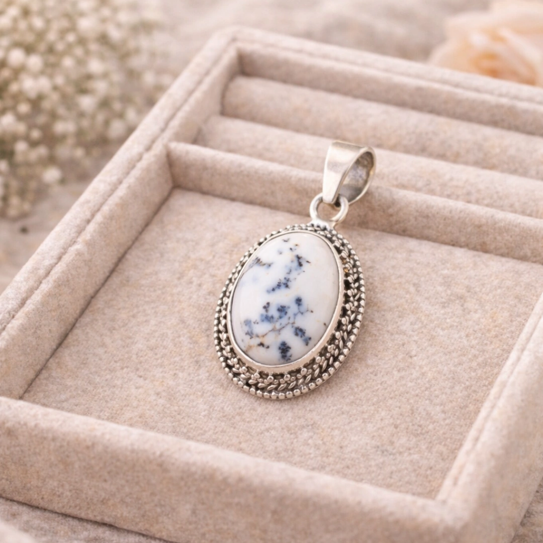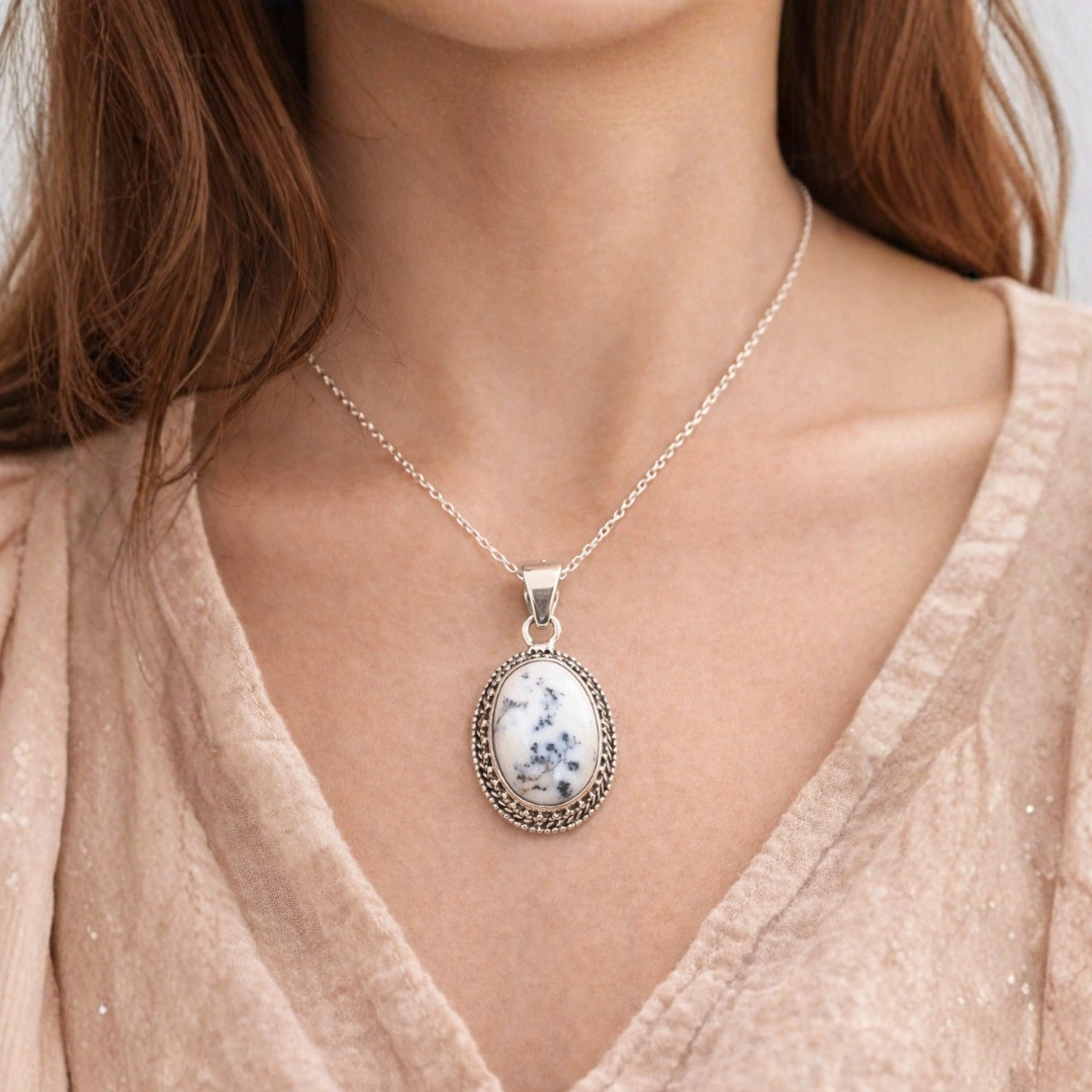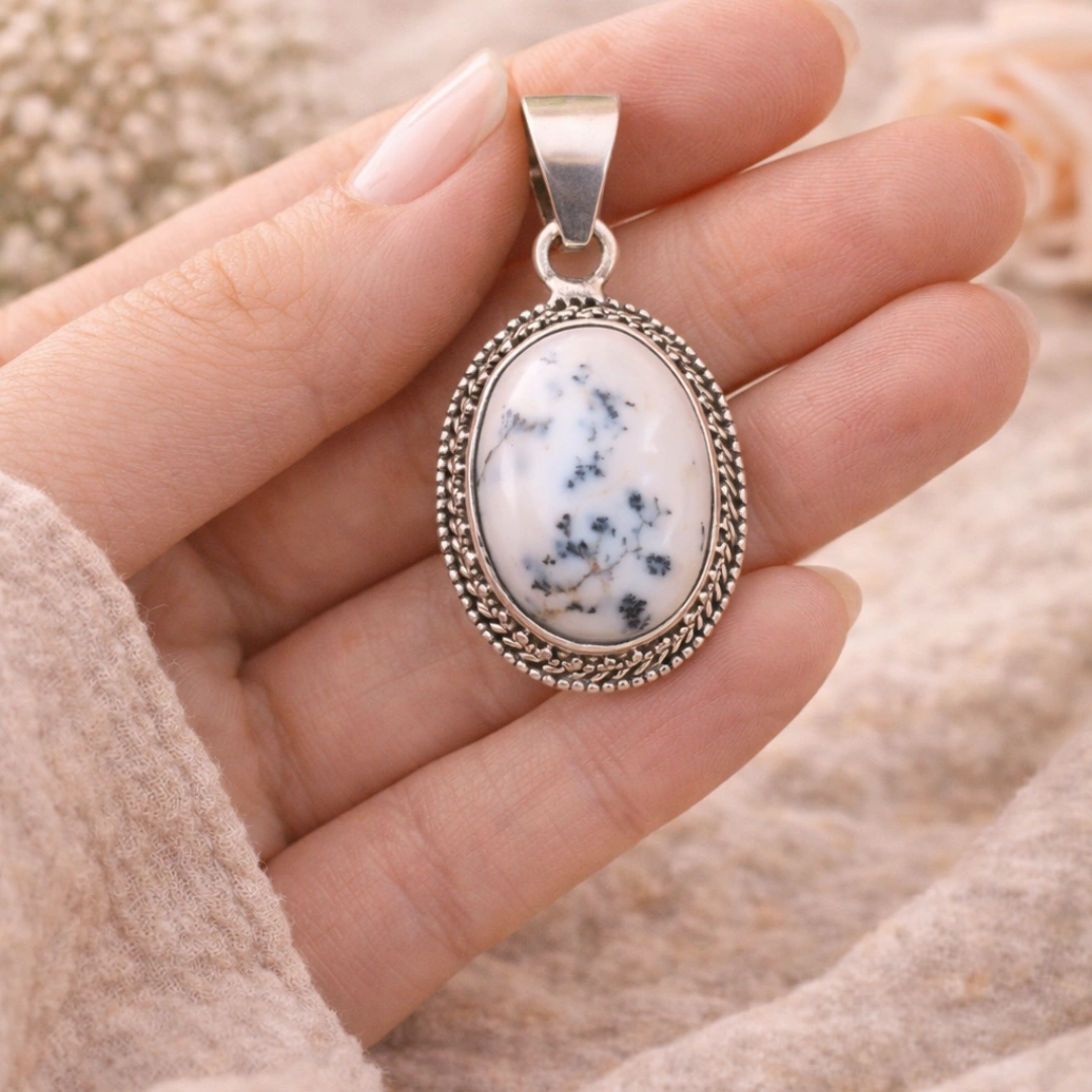 This is 100% NATURAL Dendritic Opal/Agate. It's important to distinguish: "Opalite" sometimes refers to man-made glass, but our pendant features genuine earth-formed stone with natural dendrite inclusions created over millions of years. Each piece has unique, natural patterns that cannot be replicated artificially. The milky base with dark tree-like patterns is characteristic of authentic dendritic gemstones from sources like Australia, Brazil, India, or Mexico.