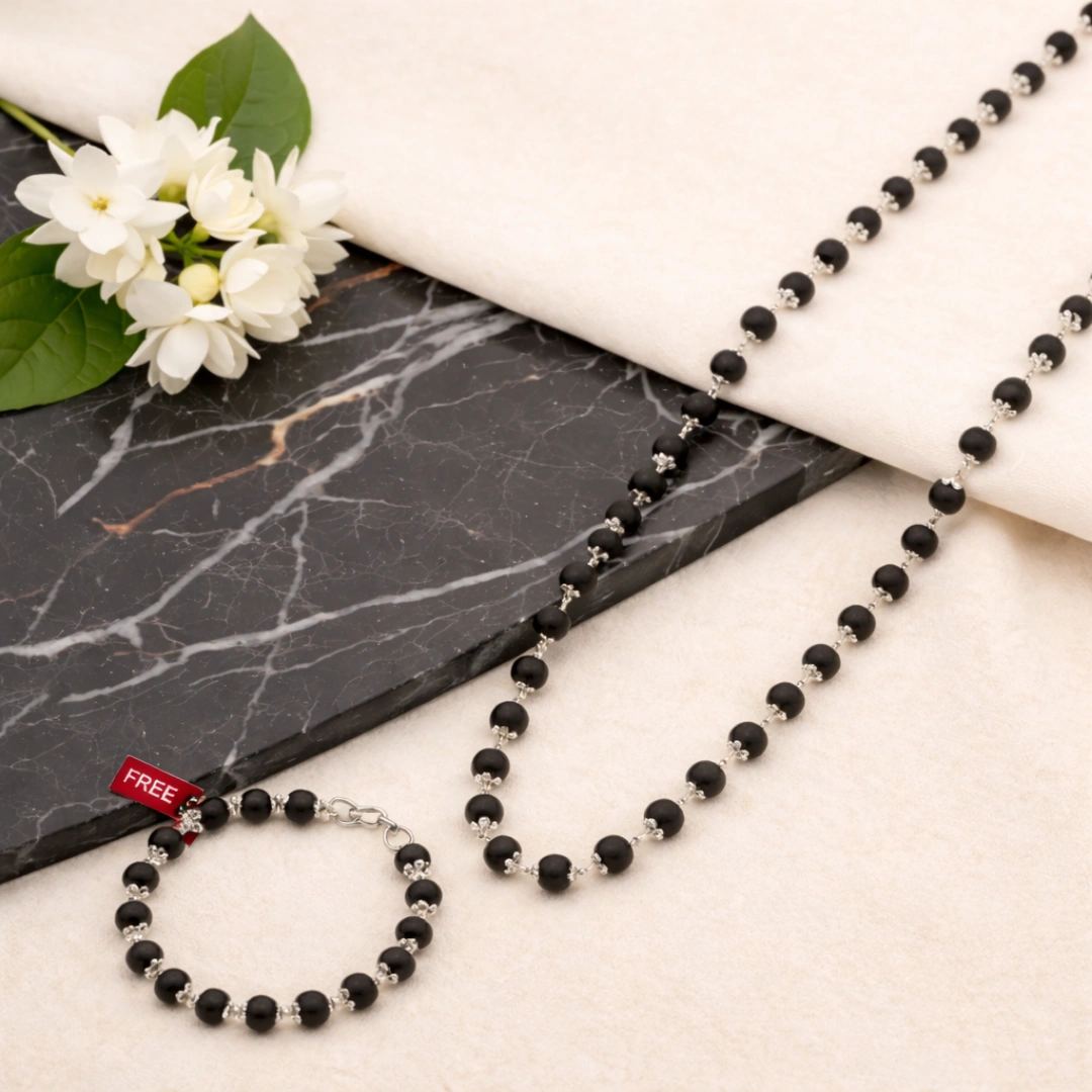 The bracelet is not an afterthought. It is not a cheap freebie. It is the same quality Karungali, the same certification, the same blessing process as the mala — provided free because the complete protection is what matters, and the complete protection requires both.