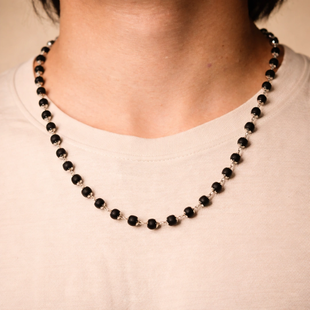 Plus — dikhne me killer lagta hai. Deep black beads + silver shine = premium look. Office me pehn, party me pehn, date pe pehn, temple me pehn — har jagah suit karega.