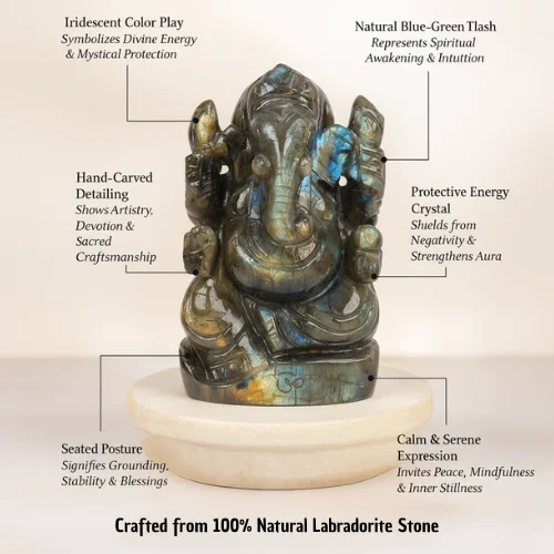 Emotional Healing — Labradorite balances emotions, alleviates anxiety, reduces stress, and heals old emotional wounds. Ganesha's nurturing energy adds divine comfort. This murti brings emotional stability and inner peace to the entire household.