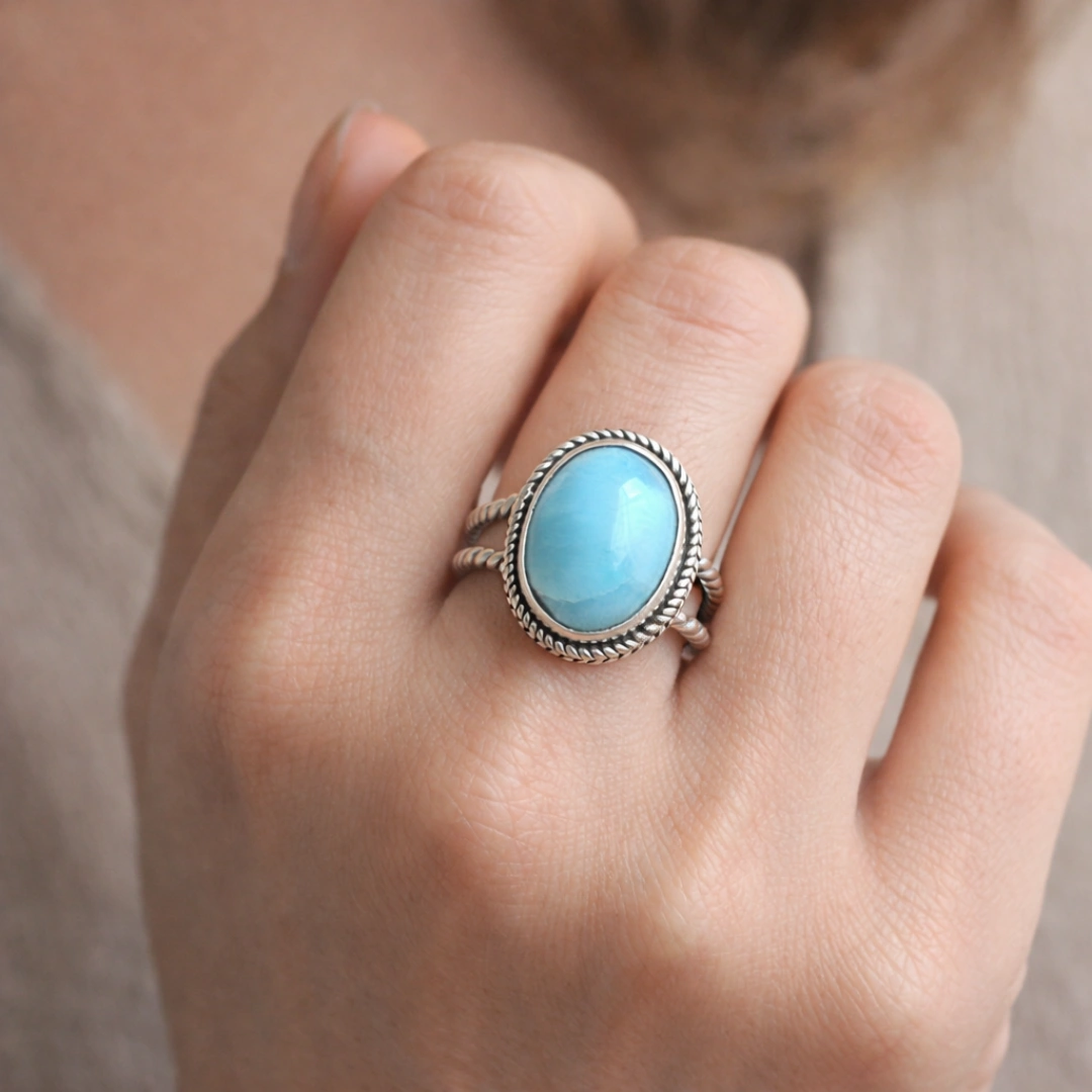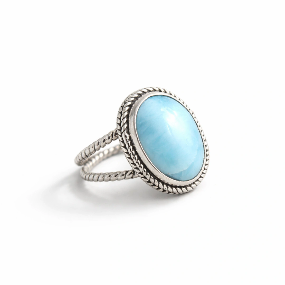 The bold statement design showcases the natural beauty of Larimar's unique blue marbling, making this ring perfect for women who appreciate rare gemstones and spiritual depth. It's more than just jewelry—it's a wearable piece of the ocean's tranquility.