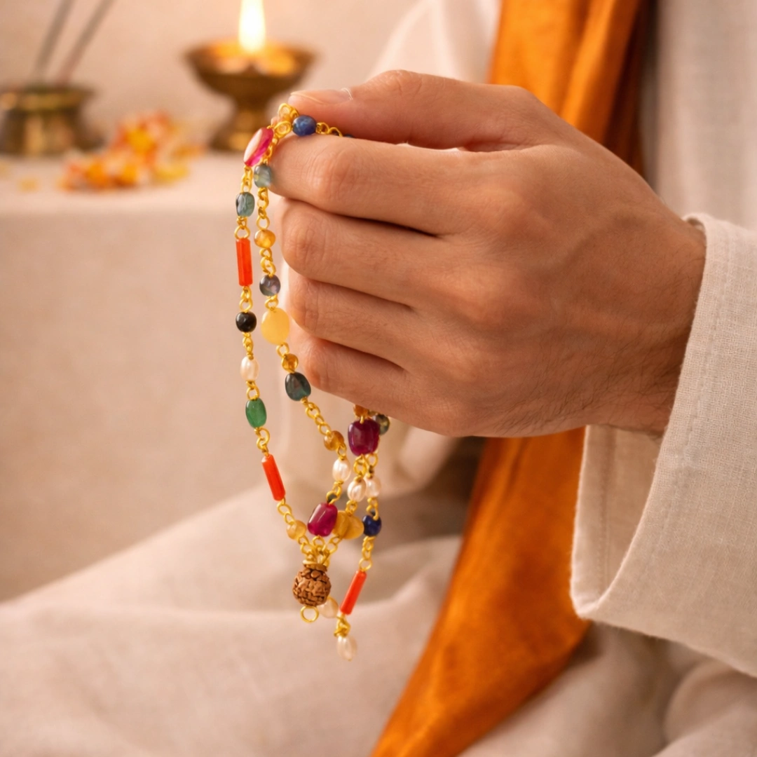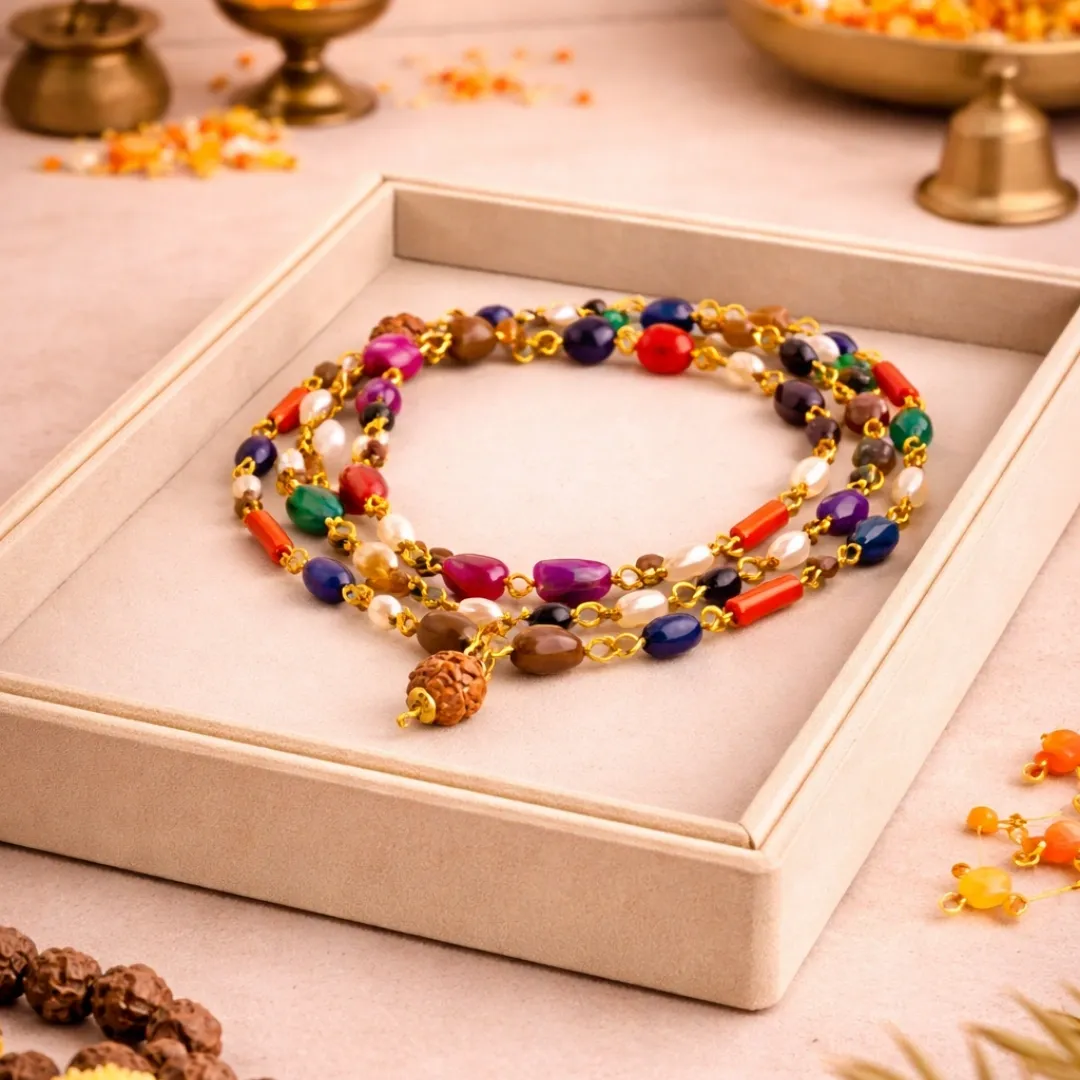 Gale Me Pehno: Daily planetary balance. Important events pe extra support. Pooja Room Me Rakho: Navgraha energy ghar me radiate hogi. Deities ke paas rakh. Diwali Pooja: Navratna mala Diwali pe rakhna bahut shubh hai. Navgraha Pooja: Specific planetary rituals me use karo. Meditation: "Om Navagraha Devtaye Namaha" chant karte hue hold karo. Griha Pravesh: New home me Navgraha blessings ke liye rakh. Gift: Affordable meaningful spiritual gift — students, family, friends ko do.