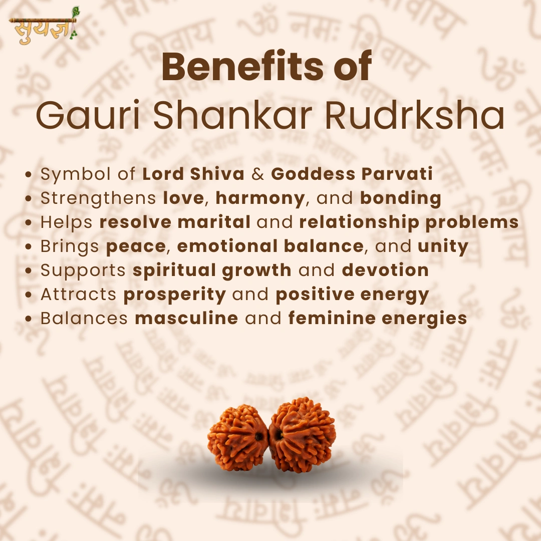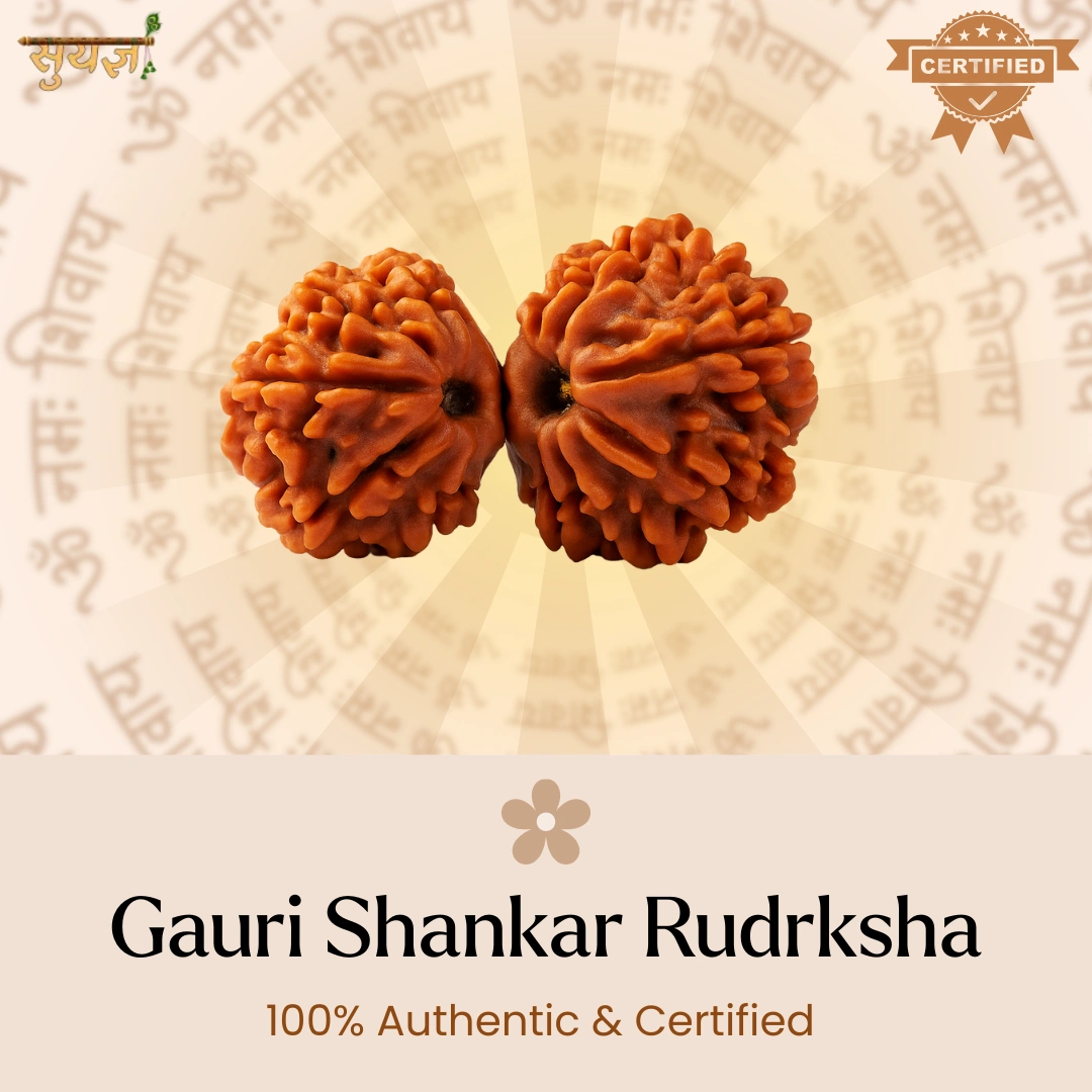 Gauri Shankar Rudraksha ko hum Suyagya mein "The Bonding Bead" maante hain. Yeh nature ka miracle hai – do Rudraksha beads jo naturally ek saath grow hote hain, joined hote hain. Yeh Shiv-Parvati ka divine union represent karta hai – wo jodi jo entire universe mein sabse ideal mani jaati hai.
