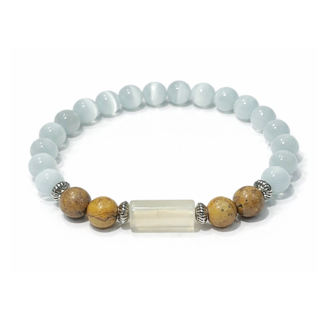 Wear this bracelet and the selenite at its center is working quietly, continuously — clearing accumulated energy, maintaining the energetic purity of the aquamarine and picture jasper on either side, and creating a gentle but consistent cleansing field around the wrist.