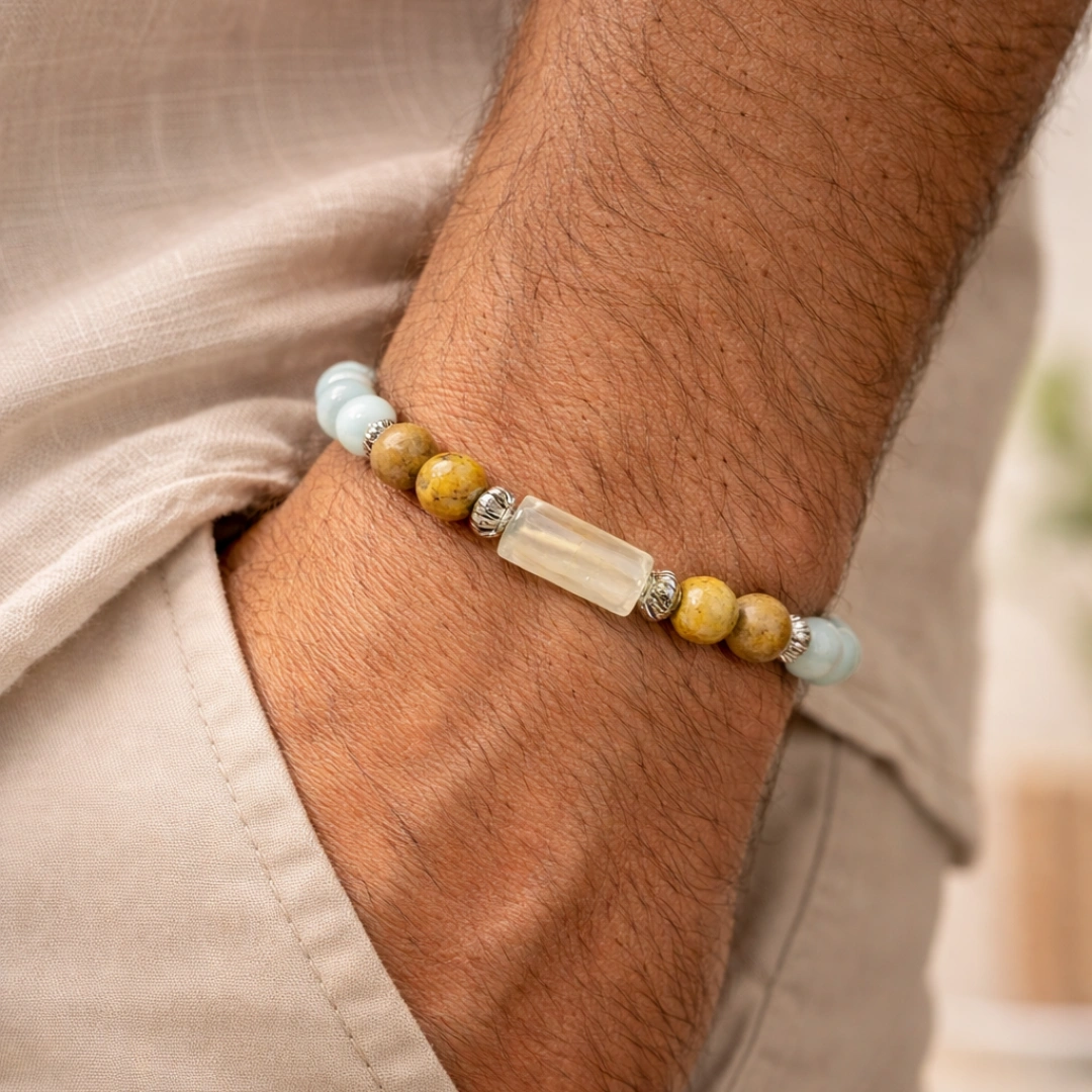 What makes the Taurus Vrishabh Rashi Aquamarine Bracelet exceptional is not any single stone — it is the relationship between all three.