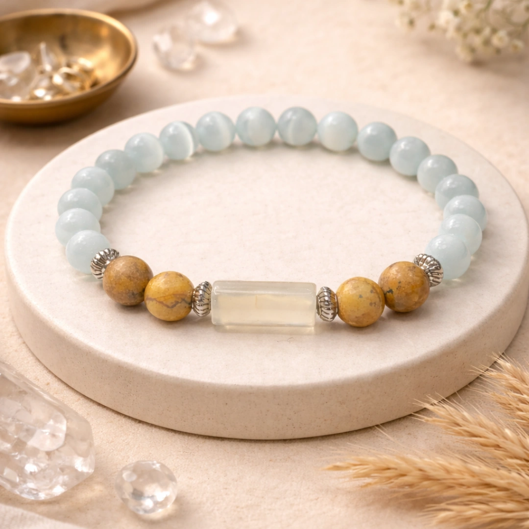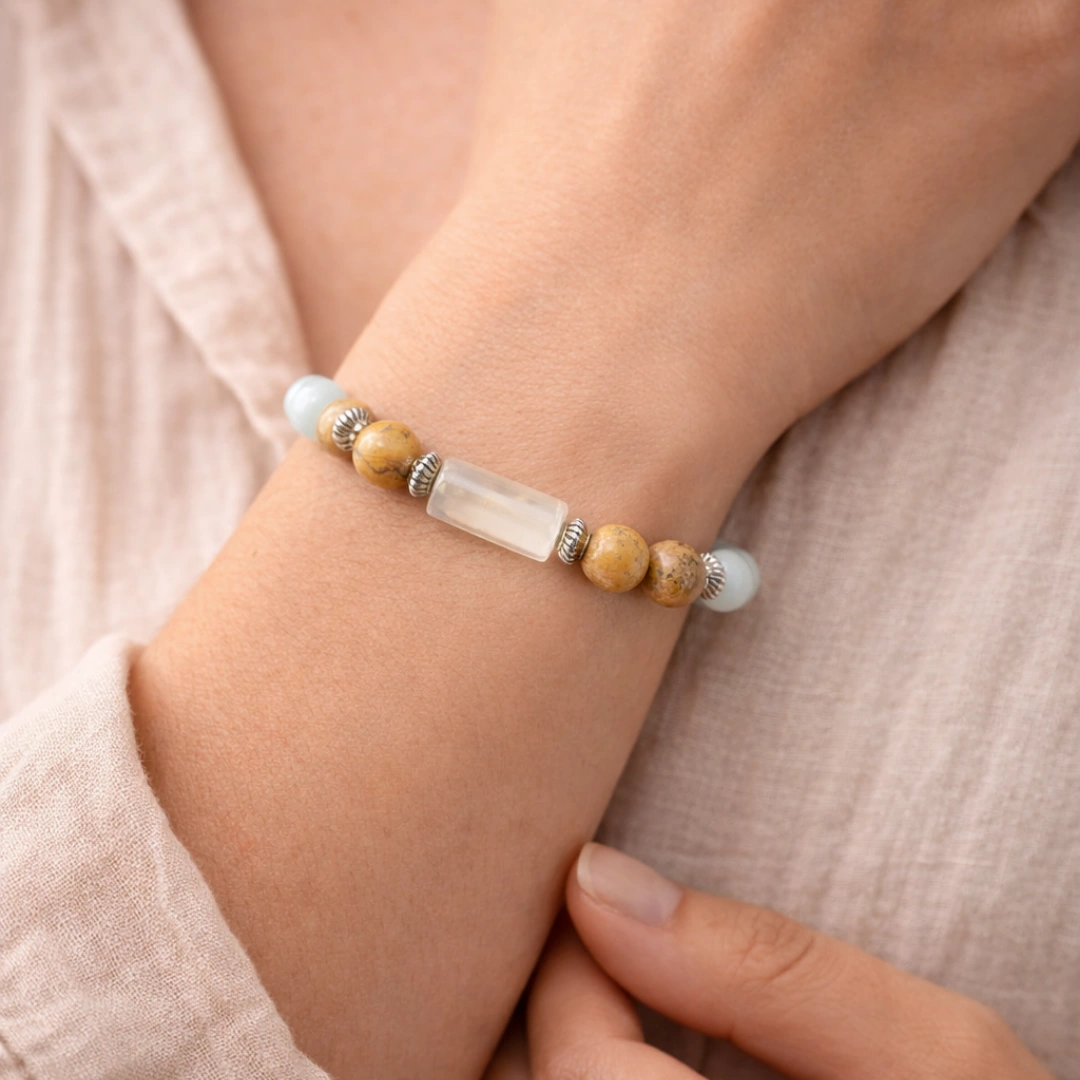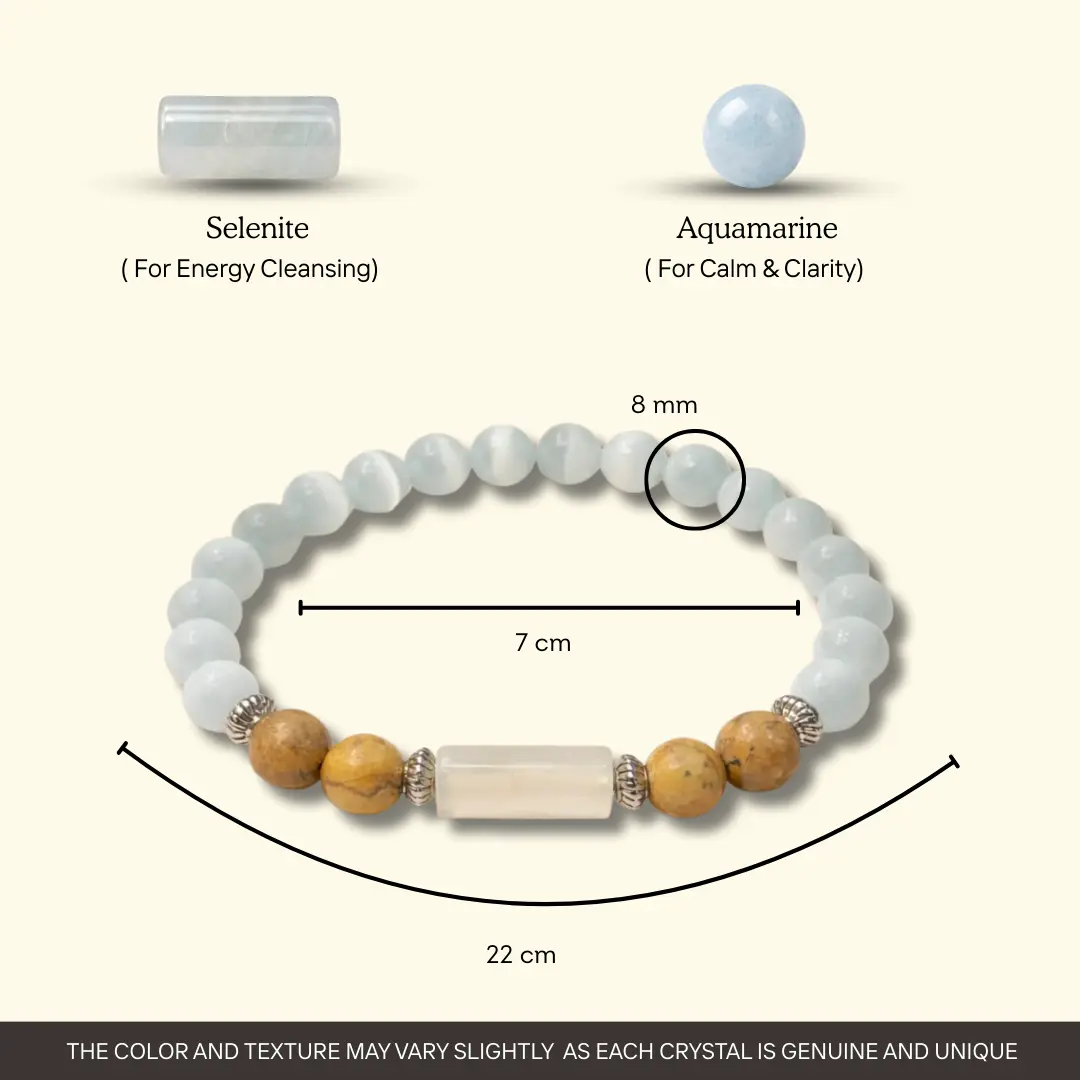 Aquamarine brings calm and clarity to the mind and heart — the Venus quality of peaceful beauty, open communication, and emotional flow. Selenite continuously cleanses and protects — maintaining the bracelet's energy and the wearer's aura without requiring constant attention. Picture jasper grounds it all in earth — providing the stability that allows aquamarine's emotional openness and selenite's clarity to rest on something real and unshakeable.