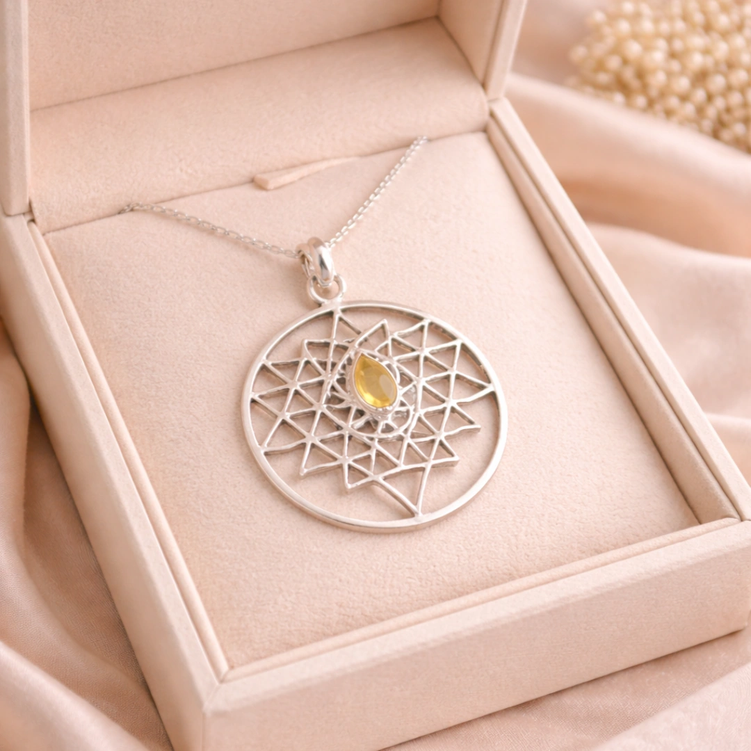 Pendant form mein Citrine directly heart chakra ke paas rehta hai — abundance WITH love.