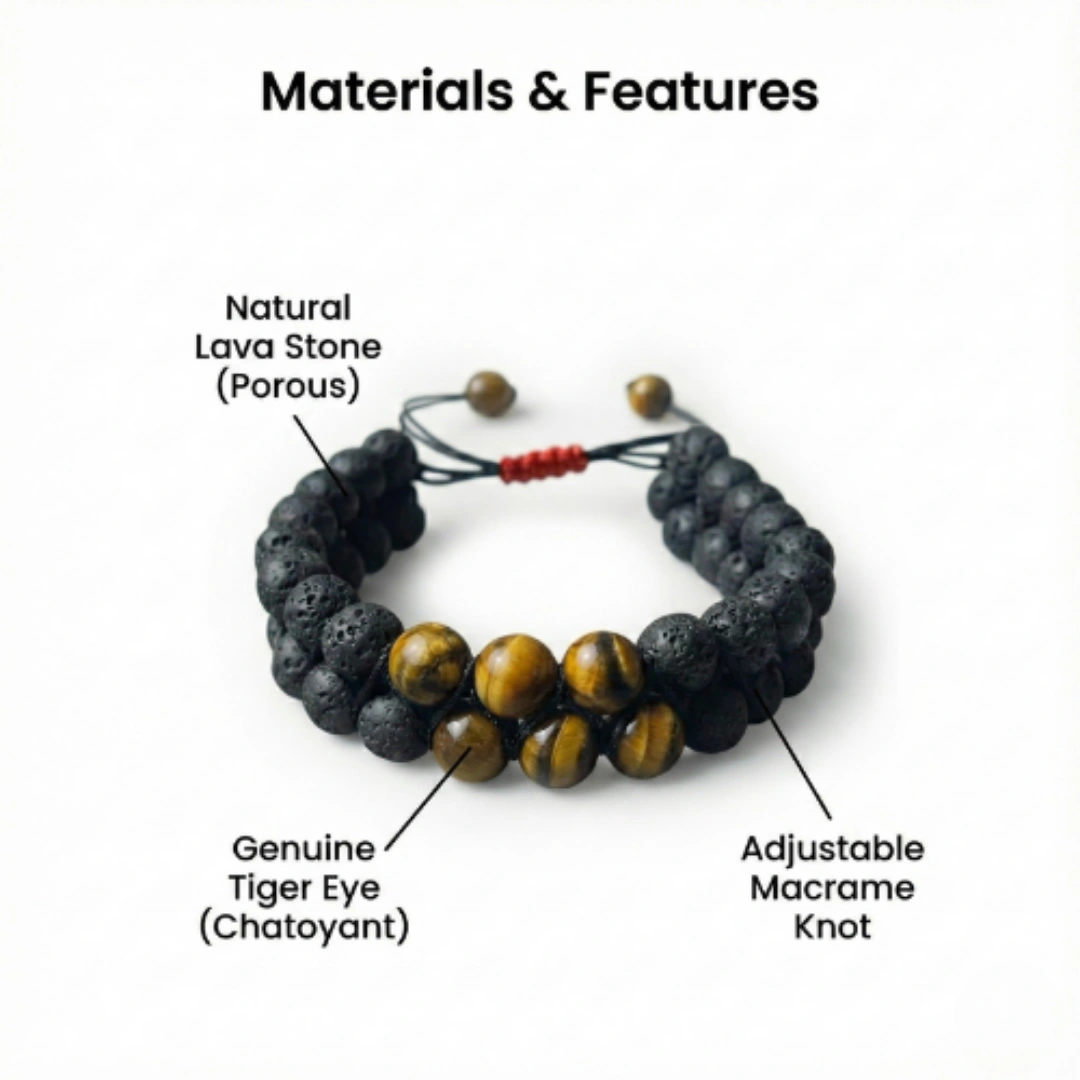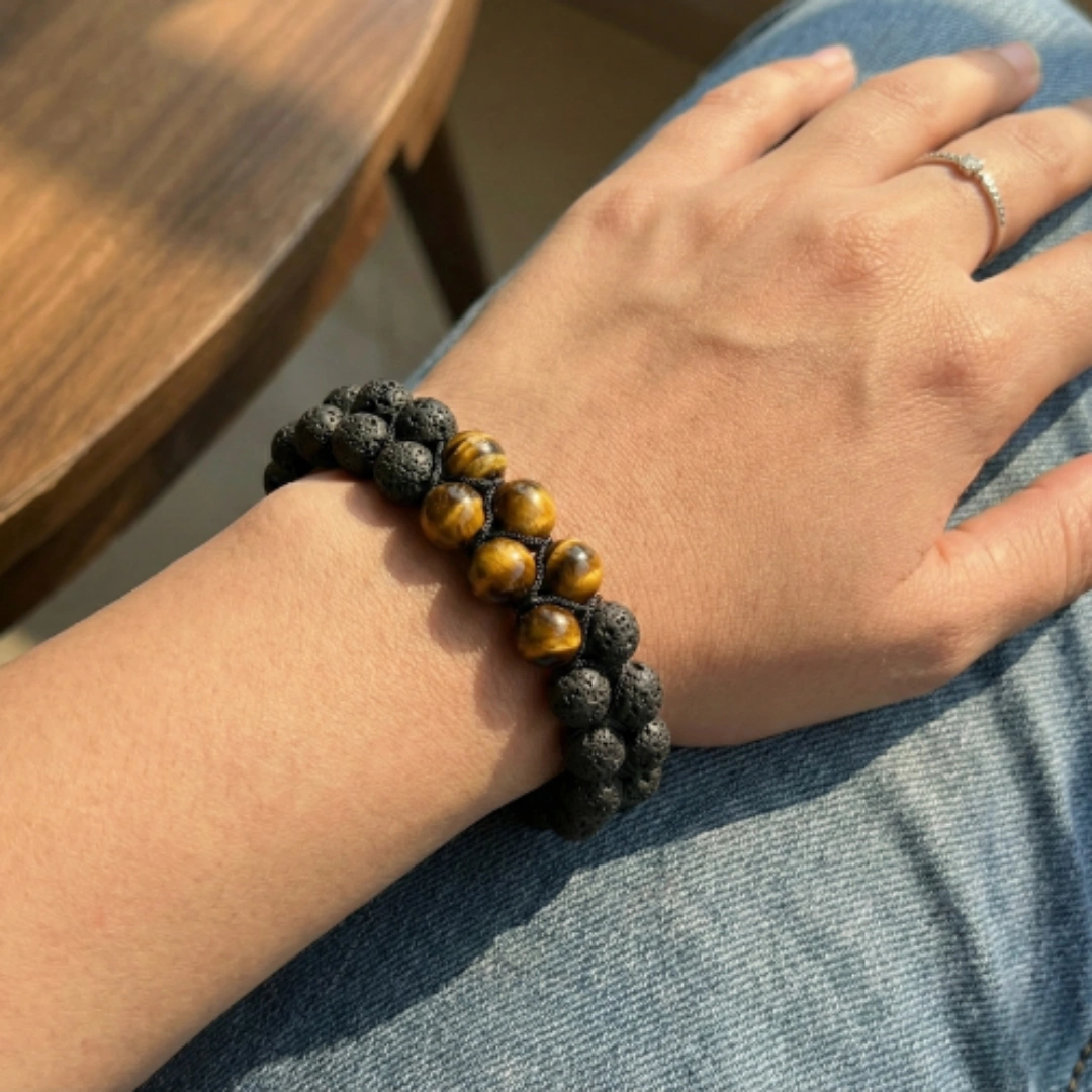 Every bracelet begins with careful stone selection — only naturally occurring Tiger Eye and Lava Stone beads are considered. Each batch is manually quality-checked for authenticity, texture, and energy. Synthetic, dyed, or machine-polished stones are rejected without exception.