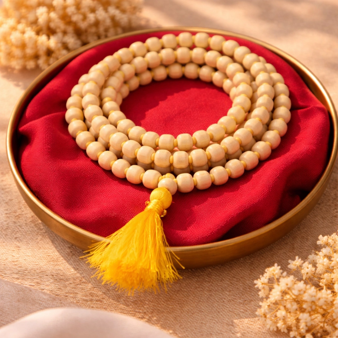 Pehli Baar: Mala ko Gangajal ya rose water se gently clean kar. Dhoop jala. Dono haathon me hold kar. "Om Namo Bhagavate Vasudevaya" 3 baar chant kar. Intention set kar — "Main ise Bhagwan Vishnu ki bhakti ke liye use karunga." Ready hai.