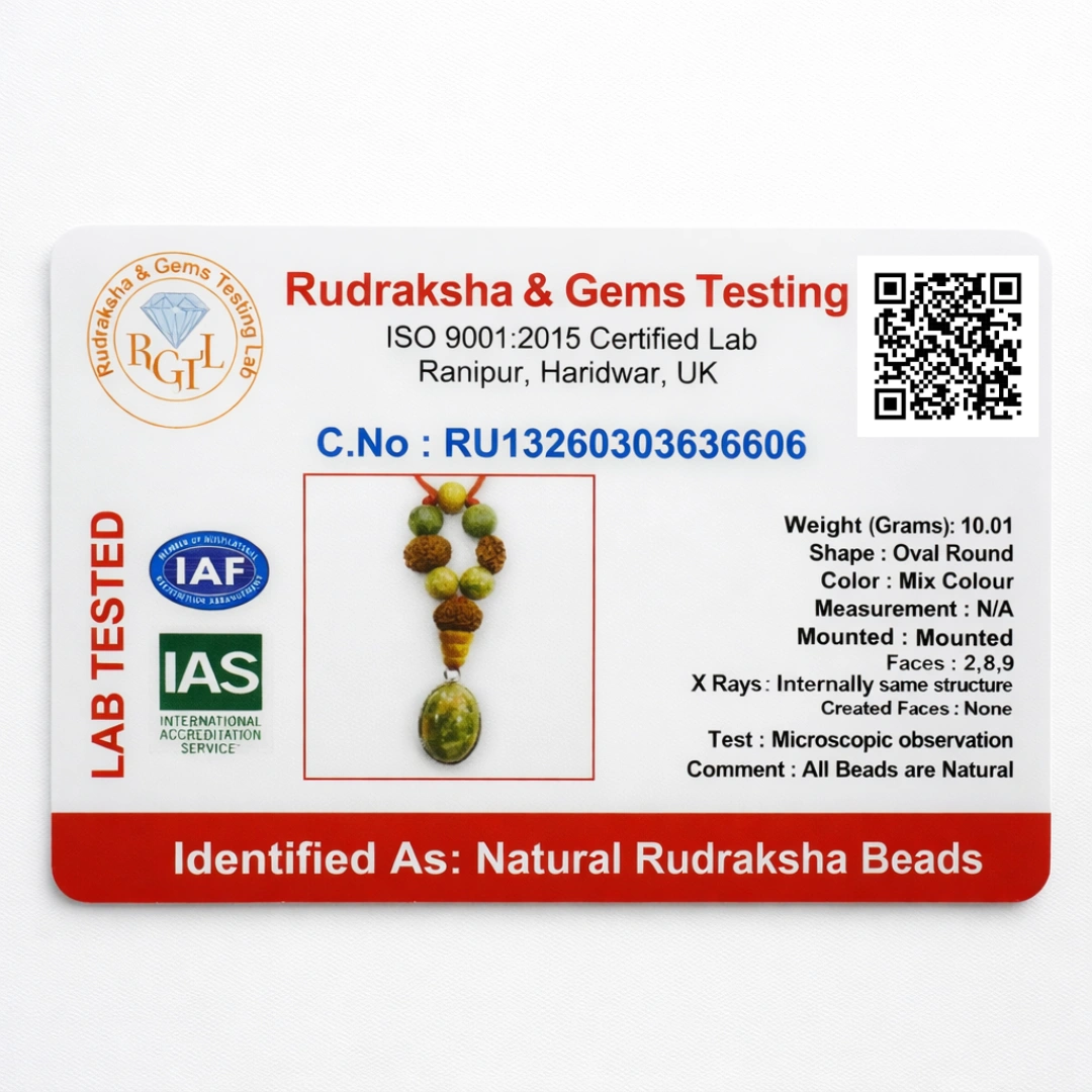 Serpentine is frequently mislabeled — similar-looking stones sold as serpentine, or low-quality serpentine without genuine energetic properties. At Suyagya, every Serpentine piece is individually selected and verified. Every Rudraksha bead authenticated — genuine 2, 8, and 9 mukhi lines confirmed. Government lab certified for the complete pendant. Certificate on request, always — because Kanya rashi will ask, and the answer must be complete. Every Virgo Kanya Rashi Pendant cleansed and Mercury-activated before dispatch — sound cleansing, Wednesday Budhvar setting, Om Budhaya Namaha activation.