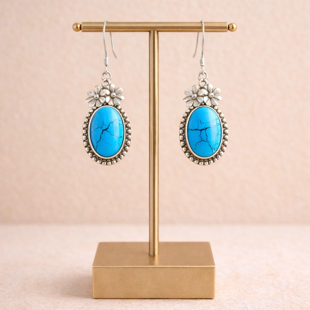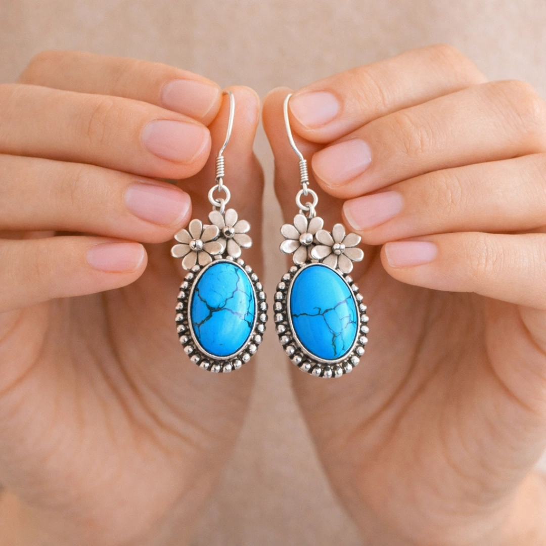 Yeh Western Flower Turquoise Earrings ready hain aapko ancient protection aur modern boho style dono dene ke liye. Western aesthetic chahiye? Turquoise protection chahiye? Unique design chahiye? Sab ek beautiful pair mein.